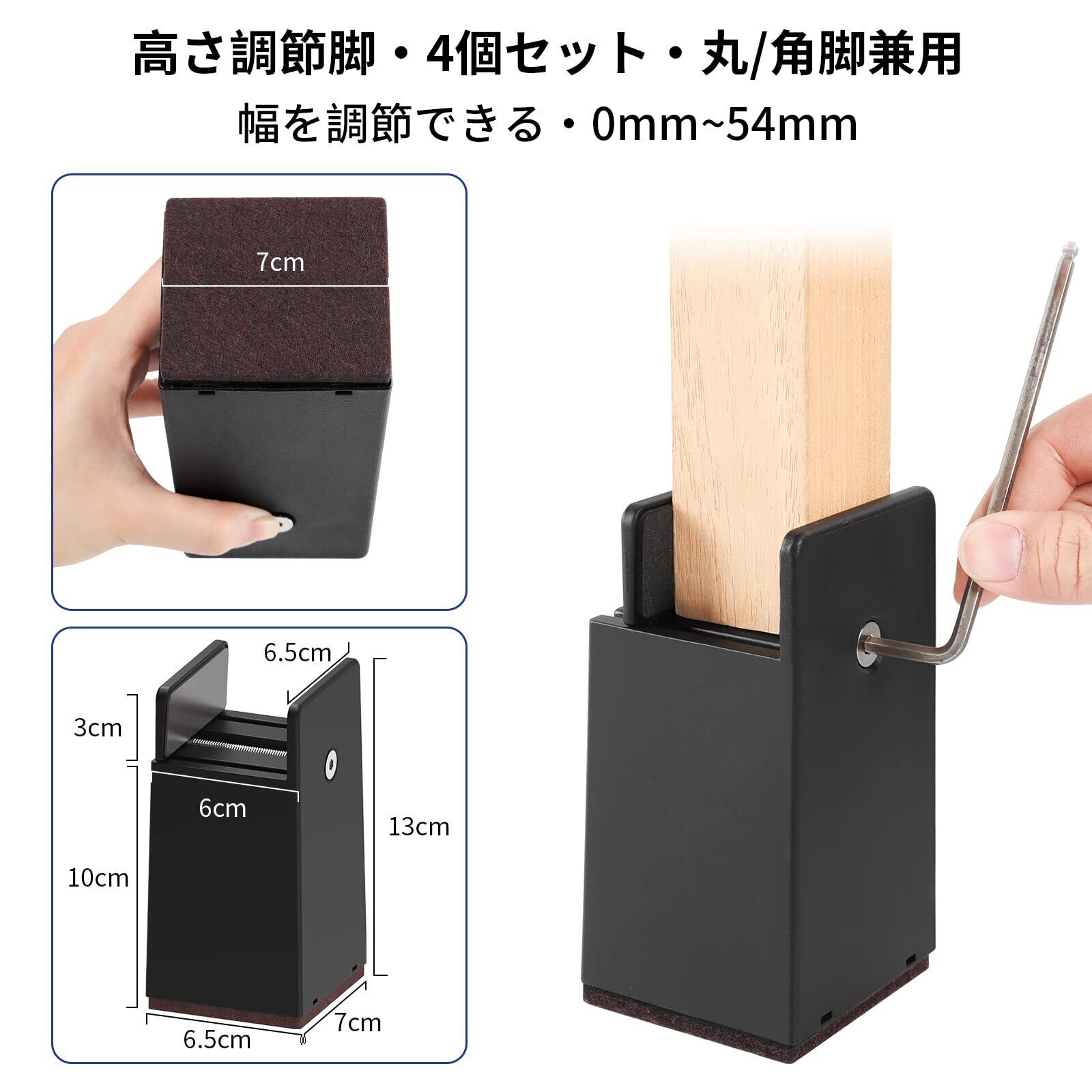 【テーブルたかさ調節】パッケージ内容:4個セット(高さ10cm)。適応脚サイズ0~5.4cm調節可能。色:ブラック。