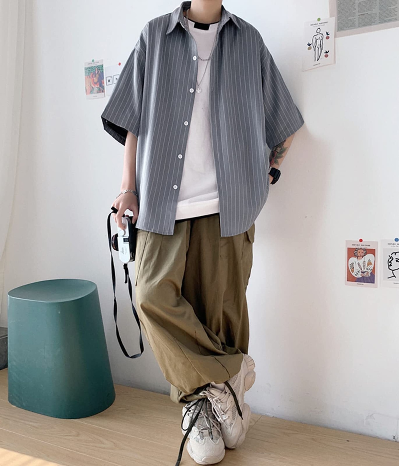 【特価商品】[Bligo] シャツ メンズ 長袖 半袖 ワイシャツ ストライプ柄 ボタンダウン L-5XL 夏服 春 秋服 ゆったり カジュアル 大きいサイズ 柔らかい シンプル おしゃれ ドロップ ショルダー 薄手 ブラウス フィット 良品生地 服 | allstore3