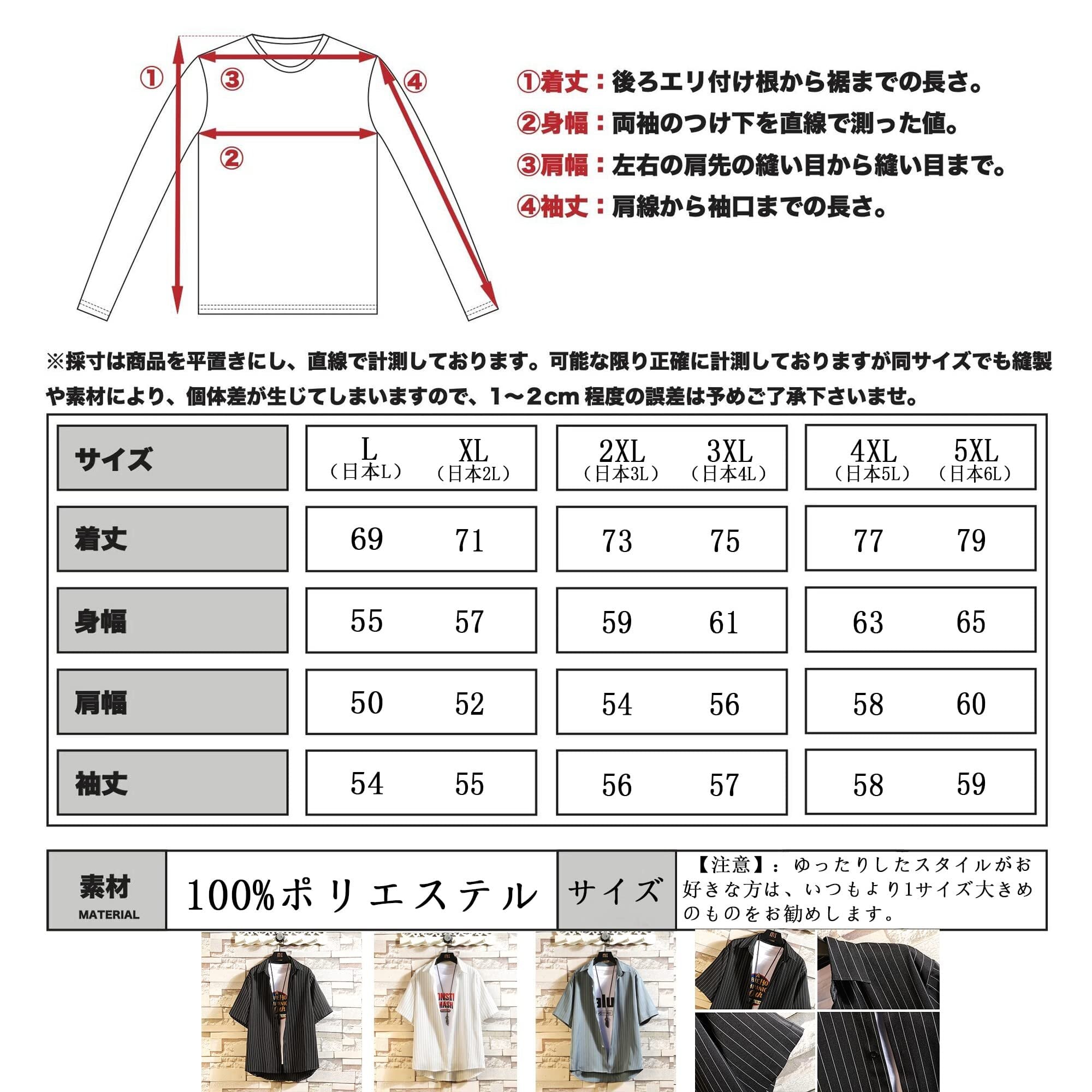 【L =日本サイズL】着丈:69cm/身幅:110cm/肩幅:50cm/身長の目安:158-168cm/体重:45-55kg。 【XL=日本サイズ2L】 着丈:71cm/身幅:114cm/肩幅:52cm/身長の目安:162-172cm/体重:55-65kg。 【2XL=日本サイズ3L】 着丈:73cm/身幅:118cm/肩幅:54cm/身長の目安:168-175cm/体重:65-75kg。 【3XL=日本サイズ4L】 着丈:75cm/身幅:122cm/肩幅:56cm/身長の目安: 172-178cm/体重:70-85kg。 【4XL=日本サイズ5L】着丈:77cm/身幅:126cm/肩幅:58cm/身長の目安:175-182cm/体重:85-90kg。 【5XL=日本サイズ6L】着丈:79cm/身幅:130cm/肩幅:60cm/身長の目安:178-188cm/体重:90-95kg。 【注意】:ゆったりしたスタイルがお好きな方は、いつもより1~2サイズ大きめのものをお勧めします。