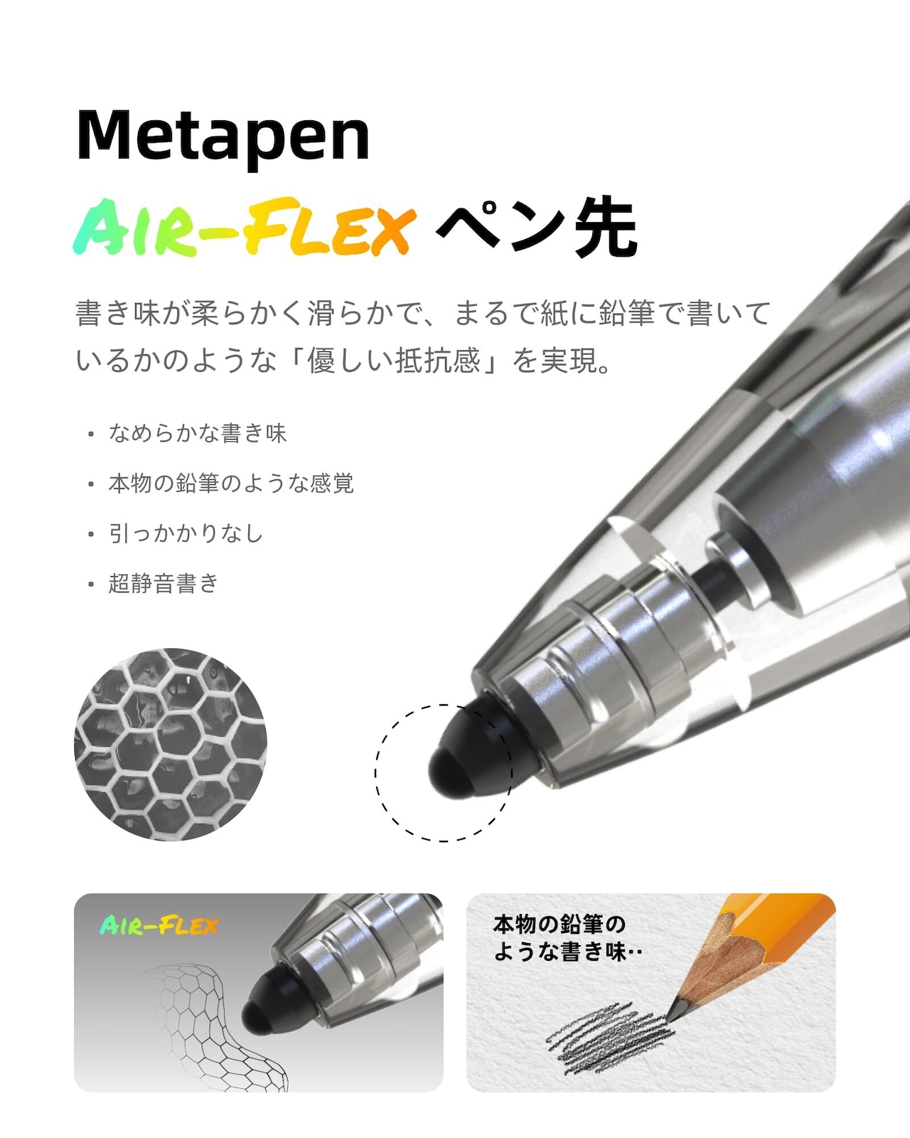 【新登場・Air-Flexペン先 ― 静音で紙のような書き心地】 Metapenは、世界初のマイクロエアチャンバーを備えたAir-Flexソフトペン先を採用。iPad画面上で優しい抵抗感を生み出し、まるで紙に書くような自然な筆記感を実現しました。従来のハードペン先よりも柔らかく、スムーズに滑って画面を傷つけません。動作音はわずか35dBで、静かな環境でも周囲を気にせず使用可能。各Air 8 Pro Xには長く使えるAir-Flexペン先が3本付属しています。