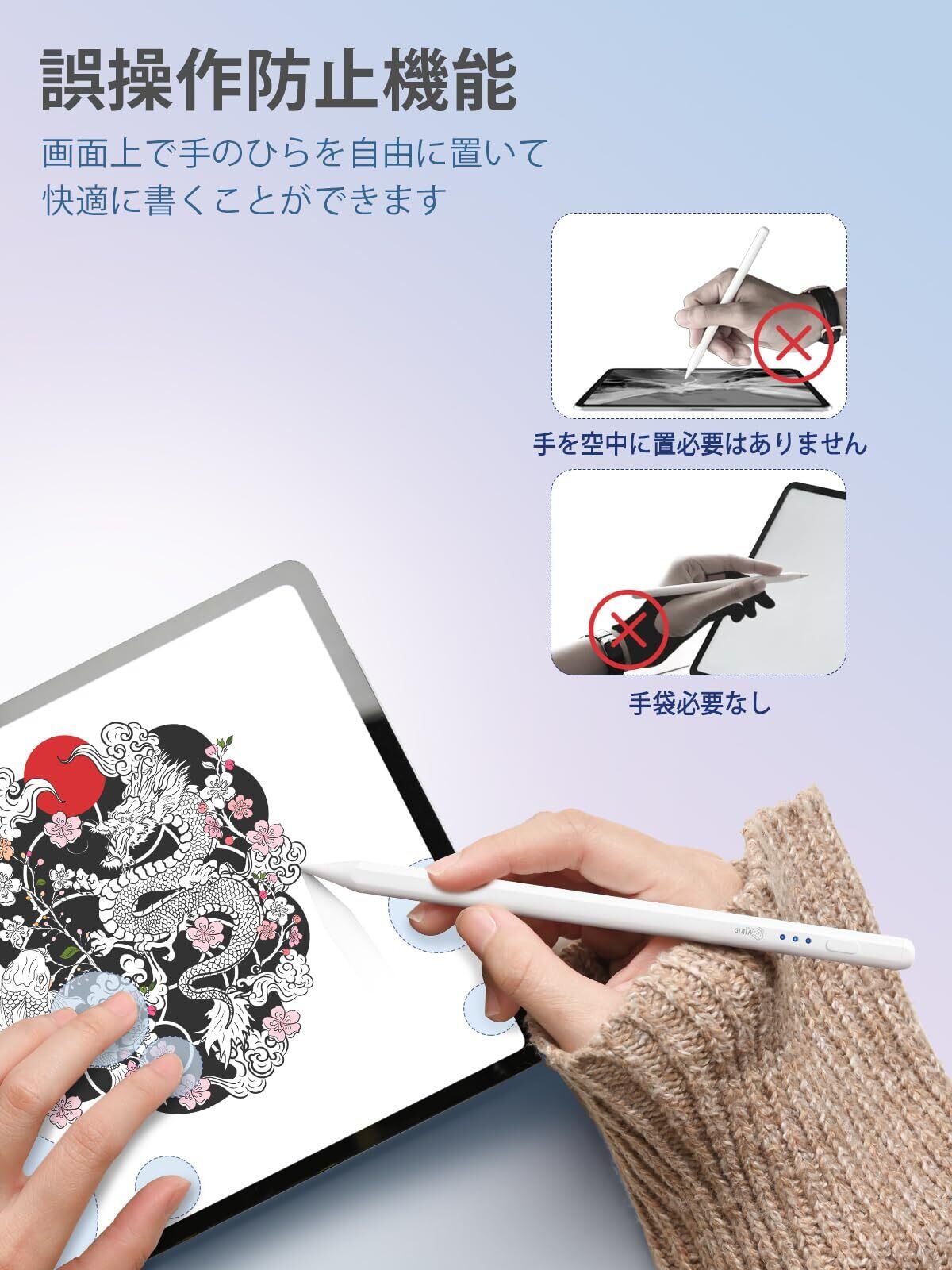 【磁力吸着&誤タッチ防止&傾き感知】Vivid Tech iPadタッチペンには2つの強力なマグネットが内蔵されており、iPadにしっかりと吸着させ、収納しやすくなっています。出張や会議などの場面で携帯することも可能です。 Vivid Tech iPadタッチペンには誤タッチ防止機能が備わっており、手を自由に置いて紙で描くように感じることができます。手袋をつける必要はありません。 Vivid Tech iPadタッチペンには傾き感知機能があり、ペン先端の角度に応じて線の太さを動的に調整することができます。これは絵を描く際に非常に適しています!Bluetoothに接続する必要もなく、面倒な設定は不要です。ペンの先端をクリックして電源をオンオフするだけなので、非常に簡単です。