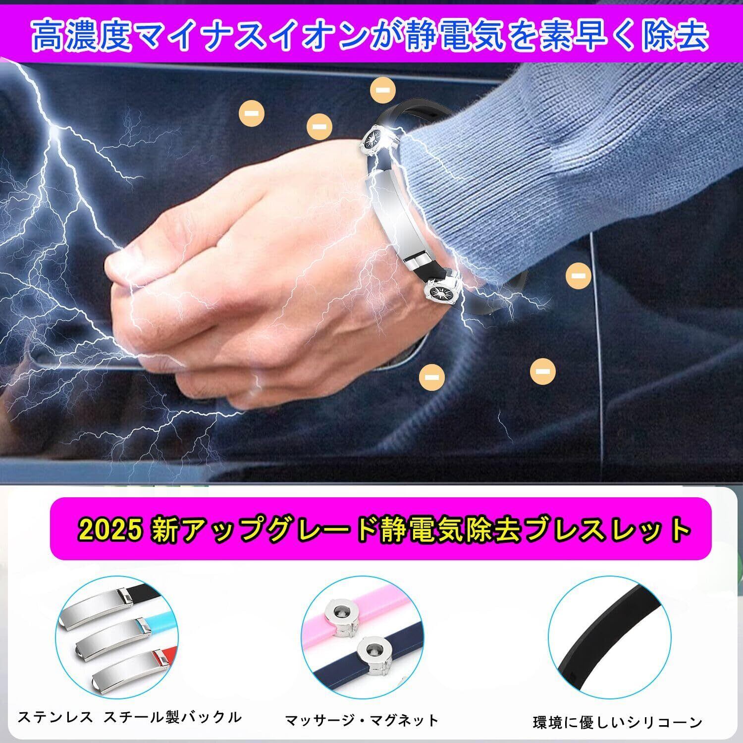 【静電気除去】静電気防止ブレスレットは、磁気リングを形成することで電流の正負比を調整し、静電気を除去する効 果 を実現します。静電気は2~3週間で軽減しますので、少なくとも1週間は着用してみてください。 着用期間が長くなると、どんどん良くなります。