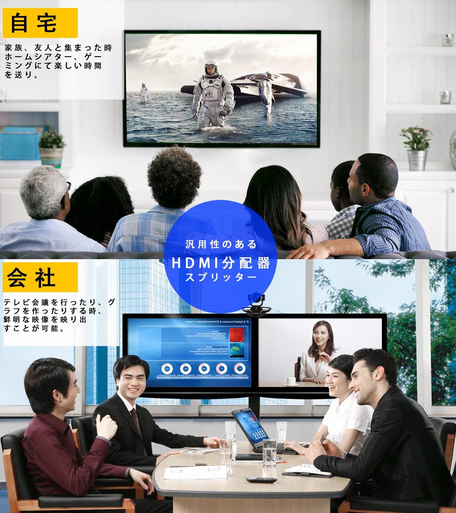多場所で利用可能のHDMI 2出力 スプリッター:2台までのHDTVに同じ映像を同時出力できるため、オフィス、会場、監視室、店頭などの場合にHDMI分配器の分配機能を活用することができます。また、HDMIの接続口に金メッキを加工したので、信号の劣化、腐食などをある程度抑えます。