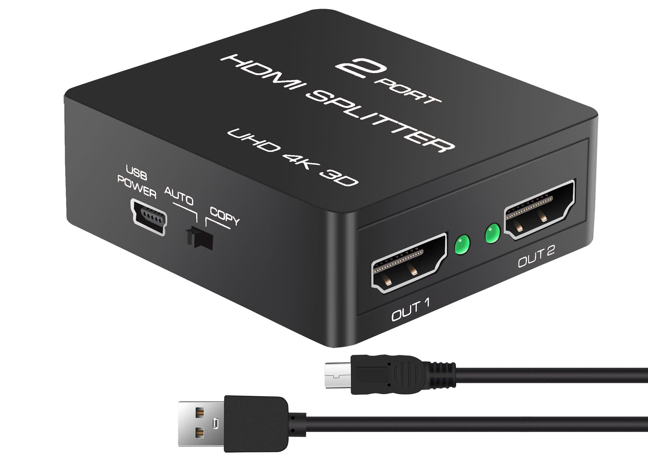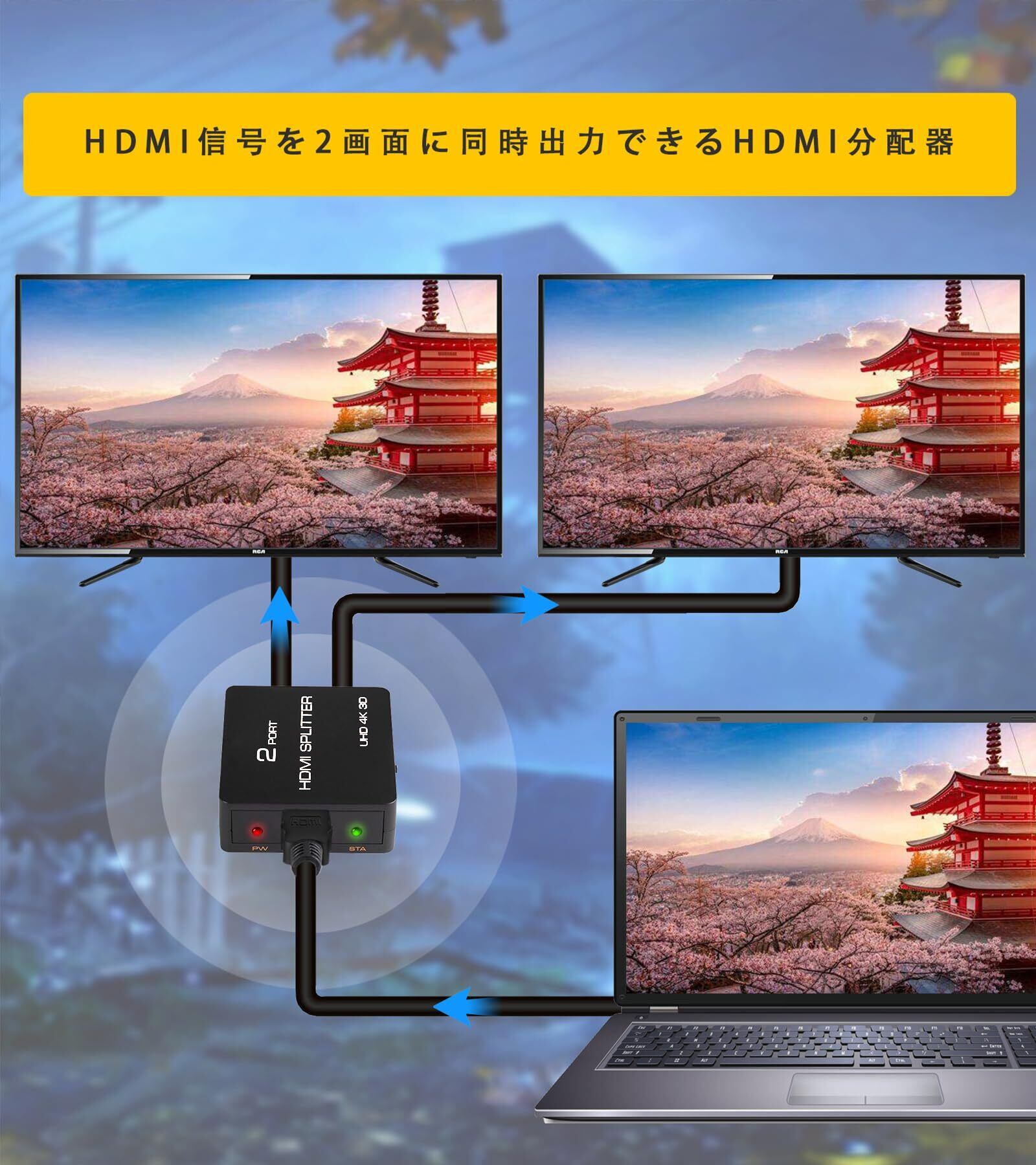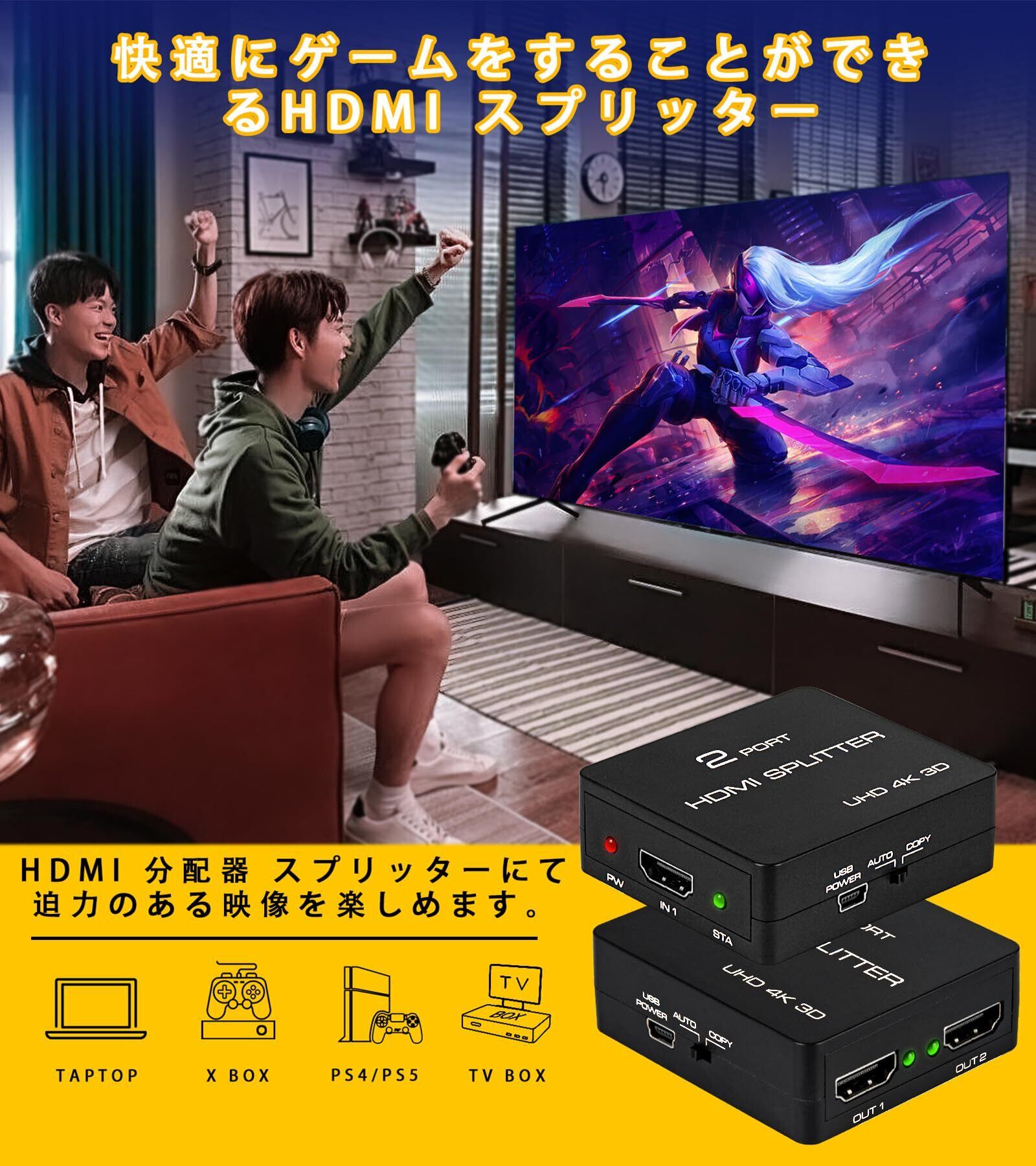 4K HDMI 分配器 スプリッター 2出力 1入力2出力 HDMI 分岐 2画面 同時出力 1080P 3D 対応 PC PS4 カメラ 任天堂スイッチ Blu-rayプレーヤー 対応 TV モニター プロジェクター 出力 USB給電ケーブル 日本語の取扱説明書付き