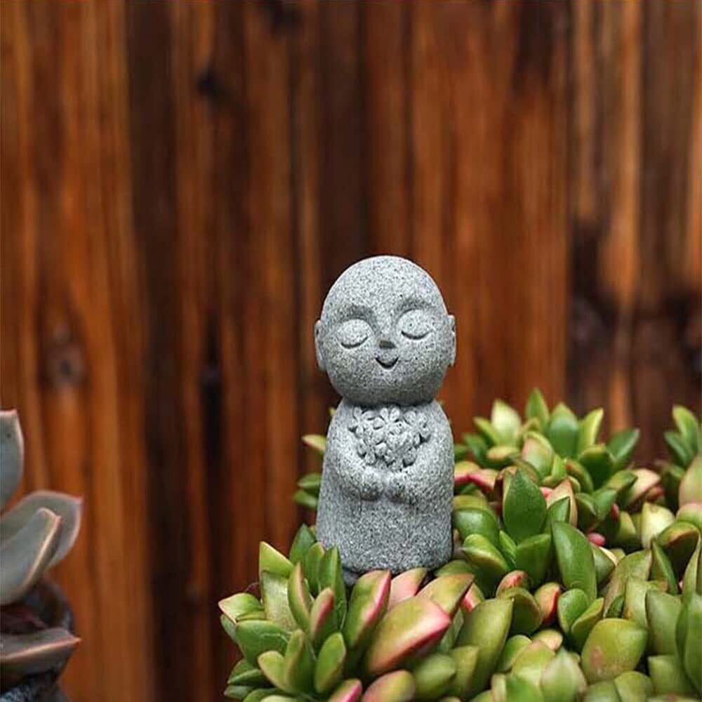 【店主からのメッセージ】:店主は京都の寺院を訪れた際、可愛らしい小さな僧侶や地蔵菩薩の石像を発見し、面白く美しい意味を感じました。帰宅後、名工の彫刻模型を探し、砂岩合成技術を使用して美しい小さな飾りを制作しました,白御影石で作られた手のひらにのせられる小柄なお地蔵さんです。