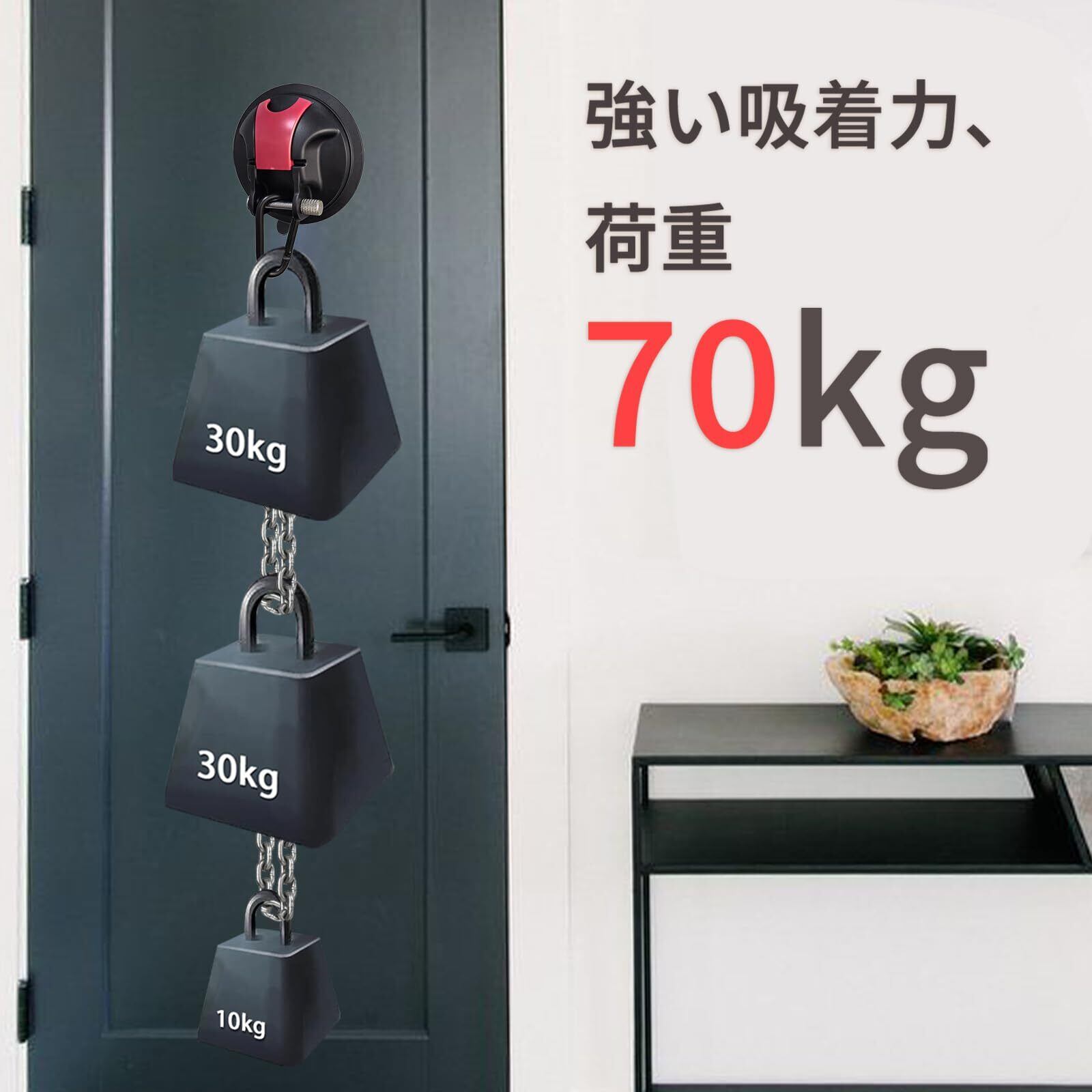 【超大型直径9cm吸盤、耐荷重70kgの高い吸着力】高品質のABSとPVC素材で作られた吸盤は耐摩耗性、耐久性に優れています。直径10cmの大型吸盤を採用したことにより耐荷重も静的70kgを実現しており、家庭でもアウトドアでもストレスなく使用できます。長時間の使用でも吸着力が弱まらず、実用試験ではガラス扉に30kgの重りを24時間かけても吸盤が動かず安定して吊るすことを確認しました。そのため風の強い屋外でもサンシェードなどを車にしっかり固定することができます。