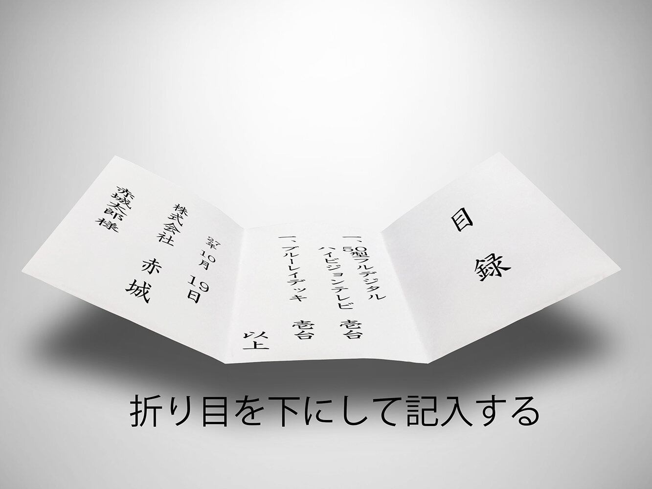 書き方の一例として、右のマスに目録とし、中央に品名、左に年月日と社名や氏名などを記入。