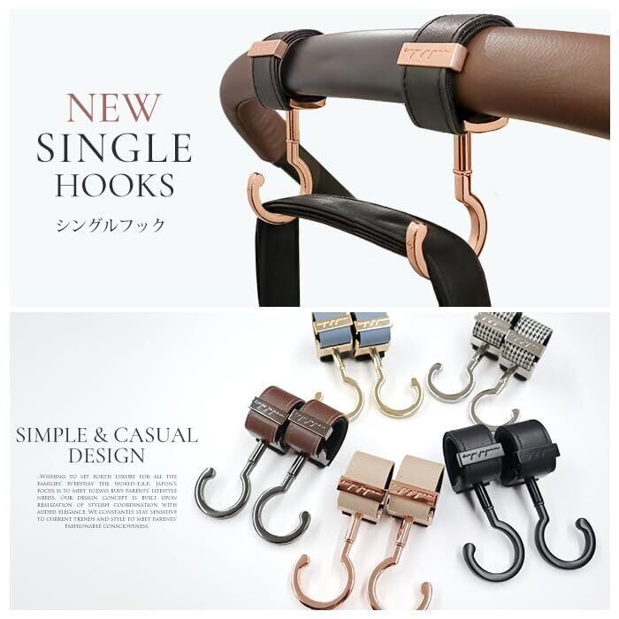LUXURIOUS BUGGY HOOKS 気軽に使いやすい回転式シングルフック。 360度回転するのでどの向きからも荷物が掛けられるベビーカーフック。 金属でできたフック部分は高級感があり強度も抜群! 旅行のキャリーケースや自転車、車のヘッドレスト等につけて収納アイテムとしても活躍してくれます。 ベビーカーを選ばないので、どのハンドルにも簡単に取り付けられます。(特殊な形状の物など一部不可) テストを重ねた亜鉛合金の強度で丈夫な仕上がりになっており耐荷重は60㎏。 ※ベビーカーの転倒の恐れがありますので、荷物のかけすぎには十分にご注意ください。