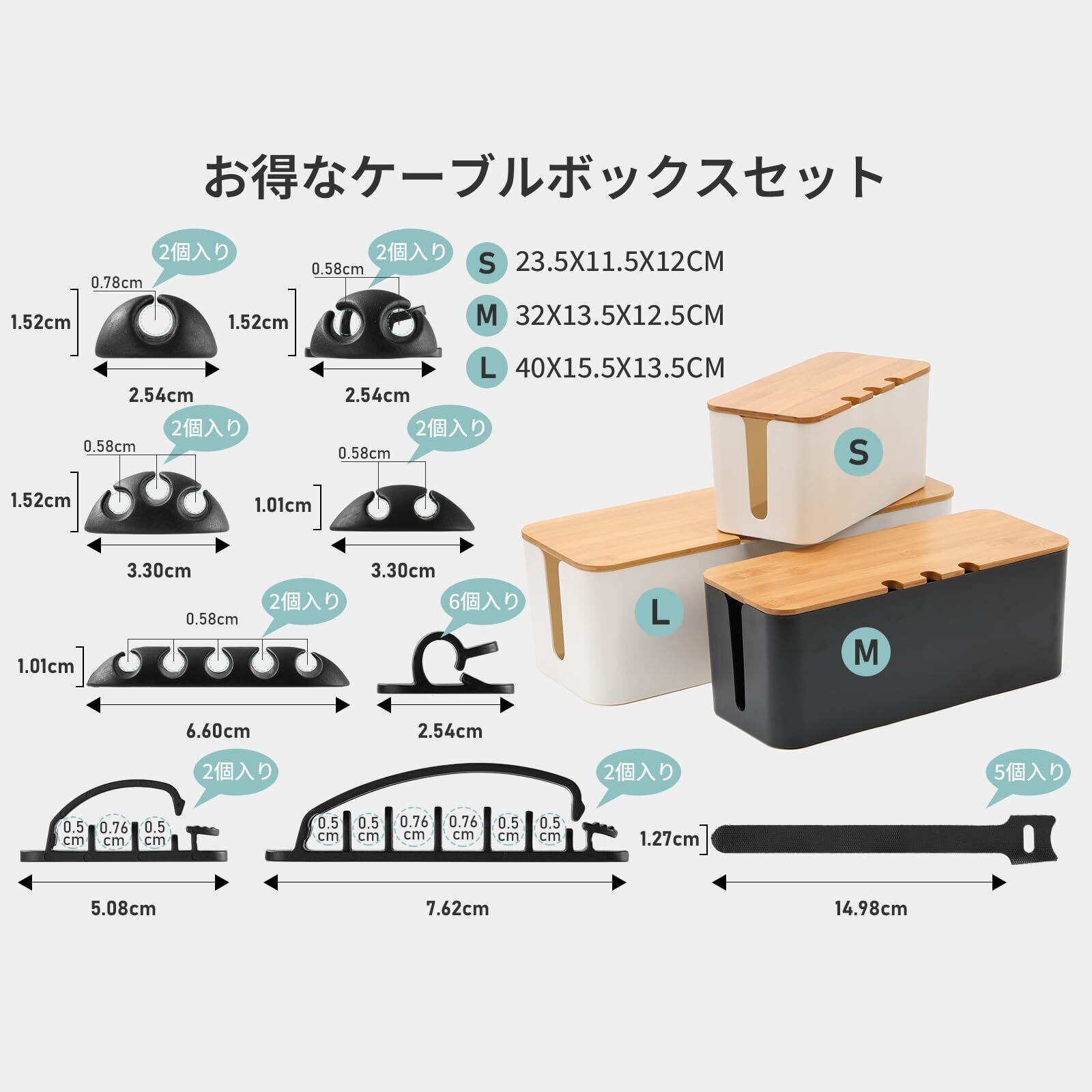 【商品詳細】材質:プラスチック&天然竹製 バッケージ内容:Sサイズのコードケース ブラック*1、Mサイズのコードボックス ブラック*1、ケーブル収束バンド*5、コードクリップ*20点。寸法:S (23.5x11.5x12cm)M (32x13.5x12.5cm)L (40x15.5x13.5cm) ※サイズの誤差は多少発生します。ご了承下さい。