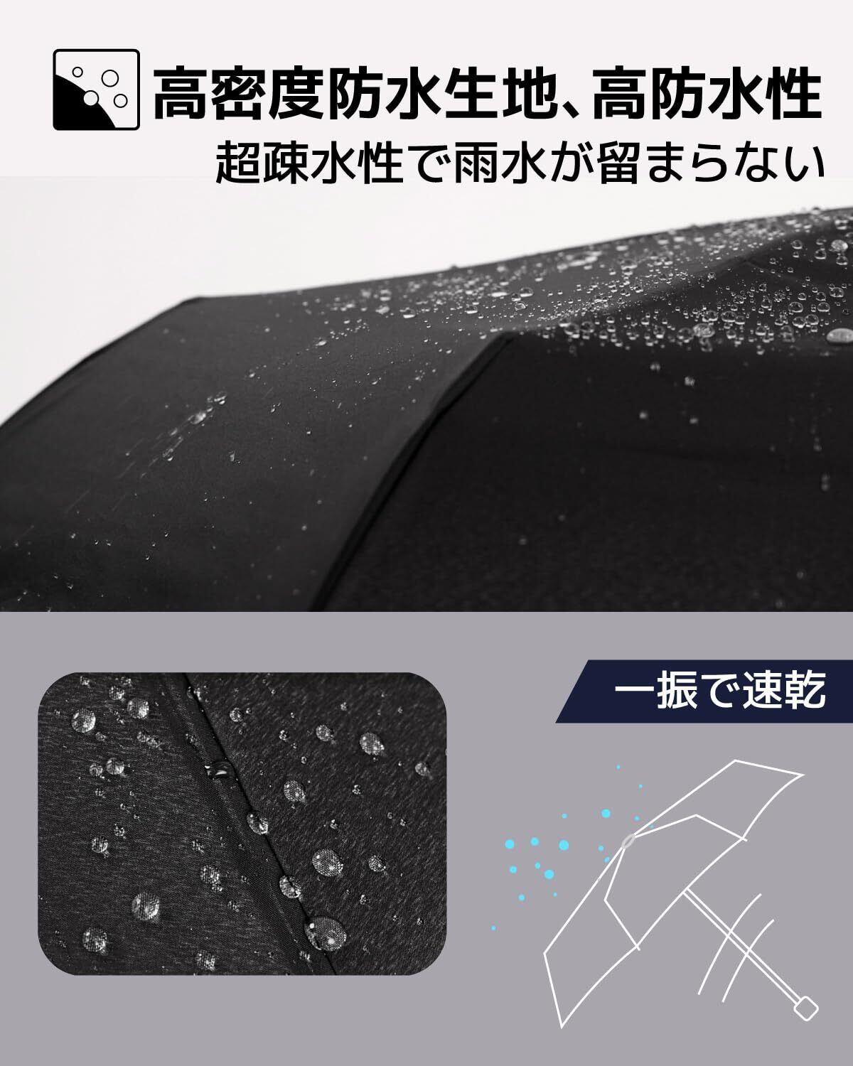 【超撥水アンブレラ】 210T超高密度のテフロンポリエステル材料で作られ、普通のテリレン製傘より撥水性に優れています。 雨がボールのように丸くなり転がり落ちる水切れバツグンの傘。傘を閉じたときに2〜3回軽く振れば、水滴はほとんど残りません。混雑した電車に乗るとき、お店に入るとき、バッグに傘を入れるとき、は不快な水滴からあなたを解放してくれます。