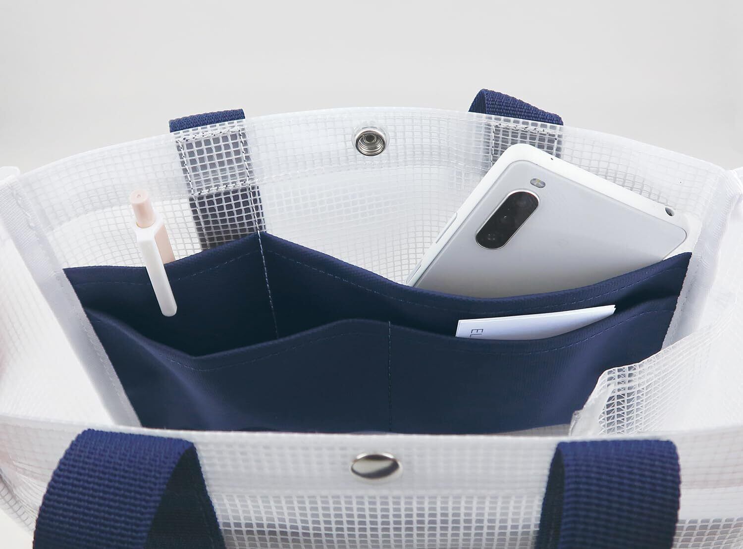 内側にはたくさんのポケットやボトルを立てる仕切り付き。ジム通いや犬の散歩に、スパバッグとして、さまざまな用途でご使用いただきます。内側の生地はターポリン生地のため、中に入っている物の目隠し効果があります。外ポケット1か所/内ポケット5か所/ボトル用仕切り1か所
