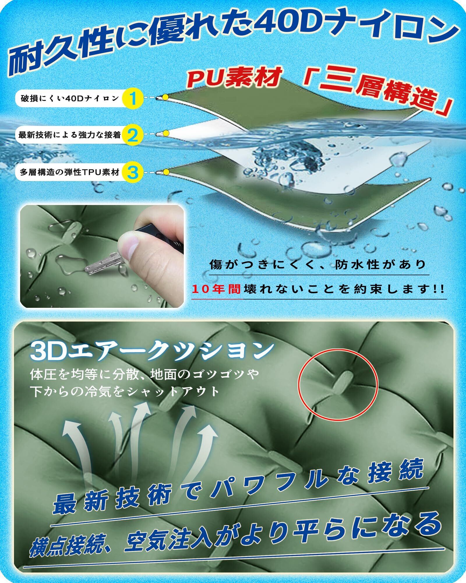 【上質な生地&いつでも清潔】折りたたみマットエアーは40Dのナイロンと三層構造のTPU素材を採用、超軽量なのに、最大90kg耐重量、高弾力と耐消耗性が強く、耐久性に優れているなどの特性を持っているため、アウトドアに最もおすすめのキャンプ用品です。水や汚れにも強い、生地は耐水加工を施しており、汚れがついた場合は、汚れた場合は濡れタオルで簡単に拭き取ることができ。突然の雨も怖く無い、屋内外での使用も可能にしました!