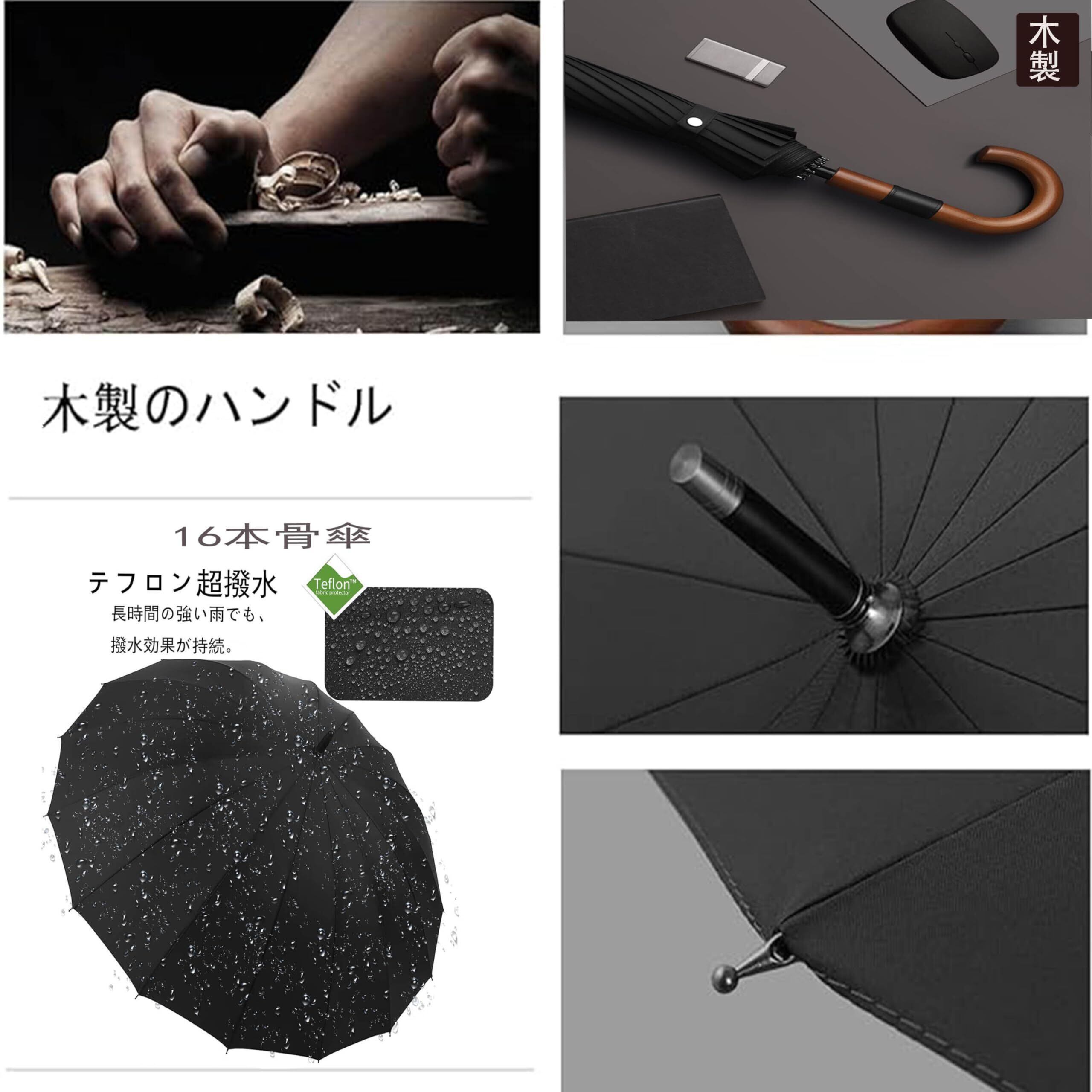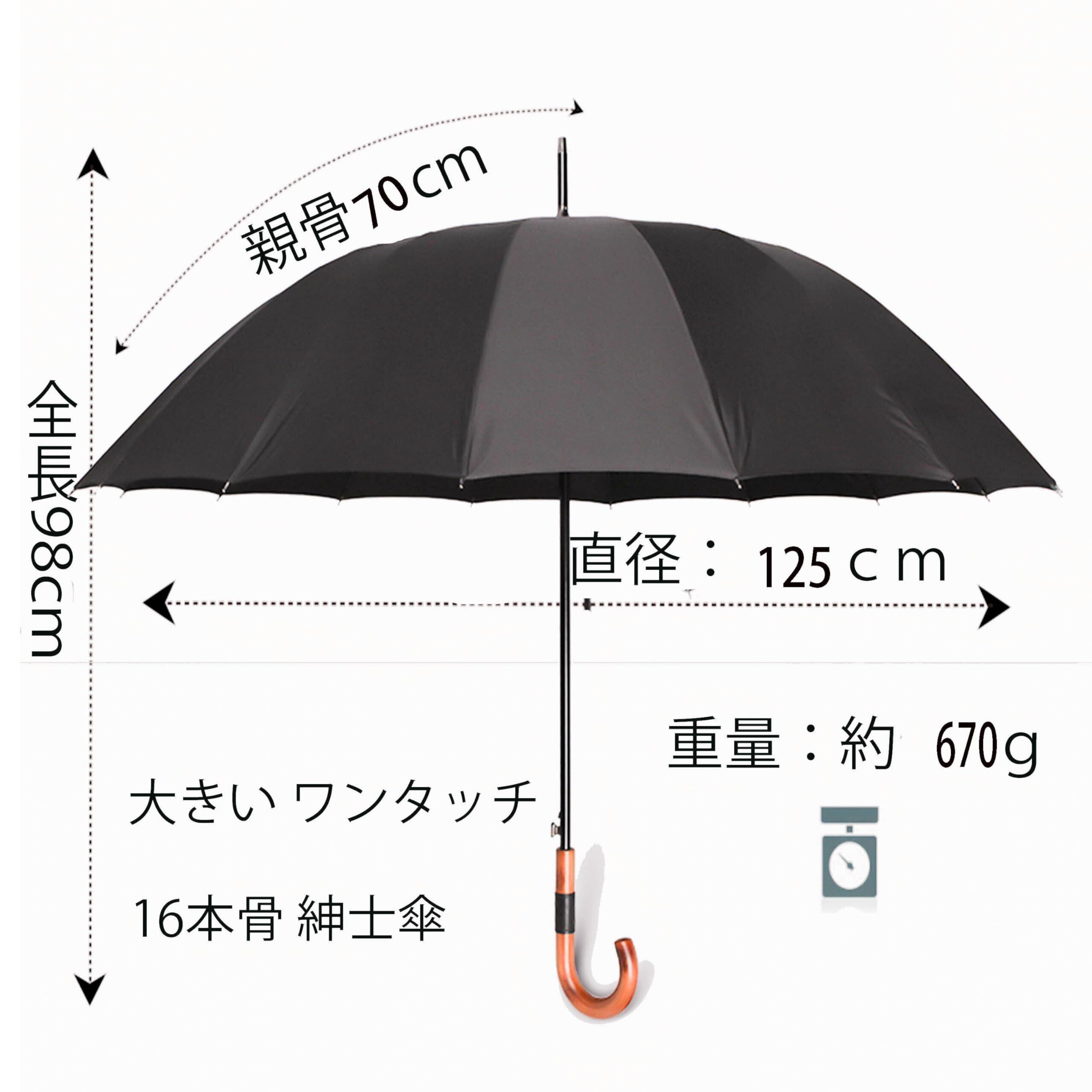 【傘の仕様】:雨傘全長:98cm、開いた時のサイズは約125cmで、非常に大きく、ゆったりとした使い心地です。2人で使用することもできメンズ傘、荷物も濡れることなく便利です。重量は670グラムで、16本の強固な肋骨があります。肋骨はグラスファイバーで作られており、耐久性に優れています。