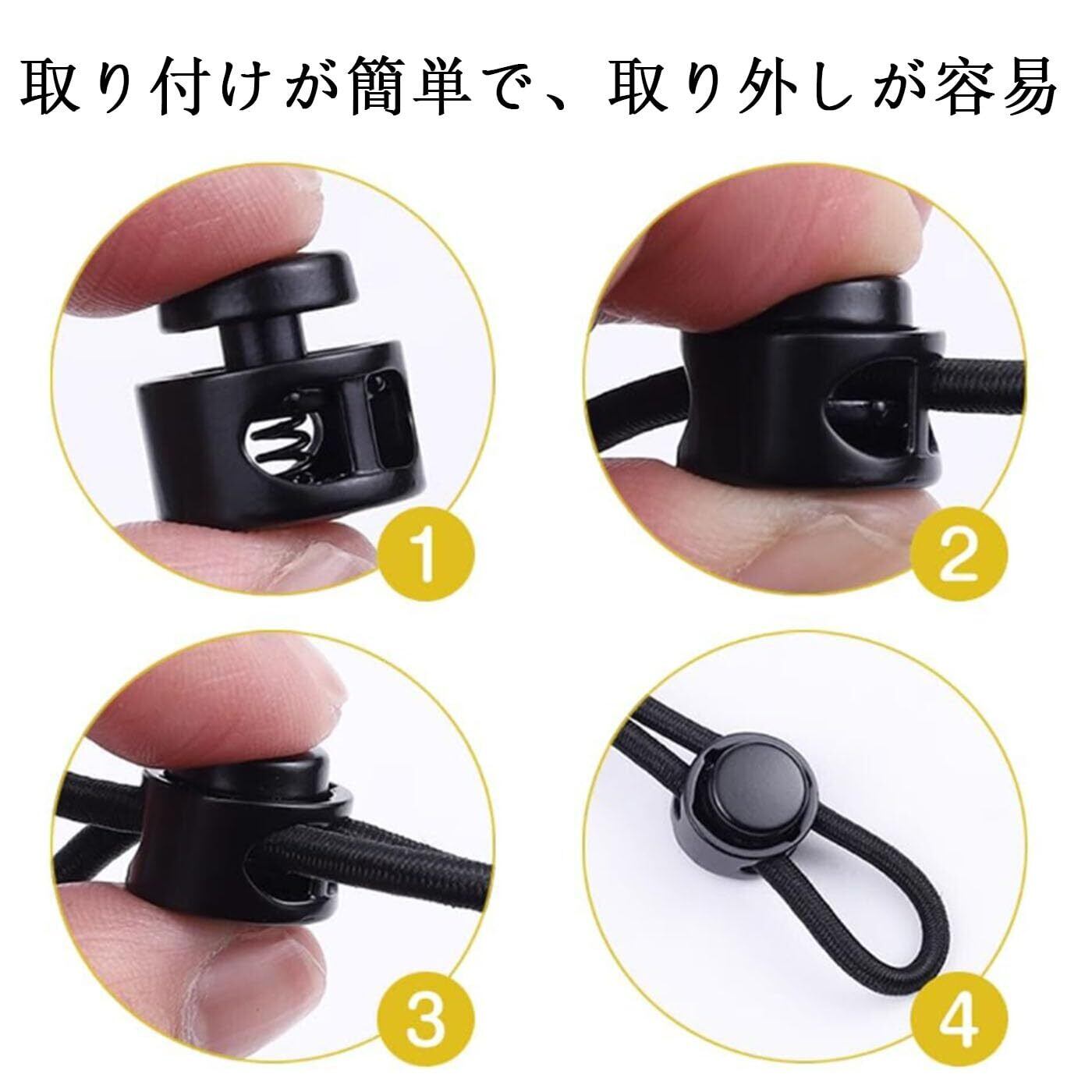 【用途】荷物、衣服、バックパック、スポーツウェア、靴ひも、テントなどに使用される損傷したコードロックの交換に適しています。紐の長さは引っ張ることで自由に調節できるため、柔軟な使用が可能です。