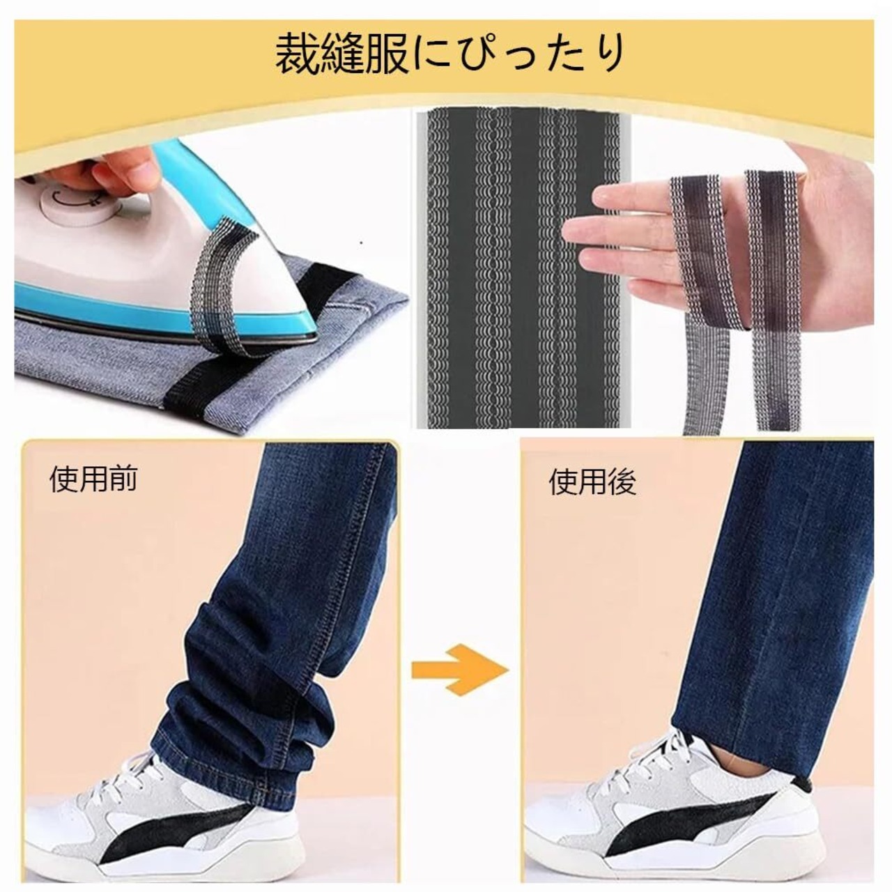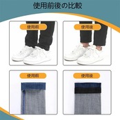 【使いやすく効率的】裾上げテープ接着方法1.スチームアイロンを約(140-160°C)の間に設定してください。2.服をよく置いた後、アイロンでを折った位置で線を折ってください。3.長さを測ってください。4.カットしたテープを冷たい水に浸して、乾く絞ってください。5.接着面(白い糸)を底に置いて、裏地で覆って、それからアイロンをかけてください。6.重力をかけて、約10秒間で完成できます。