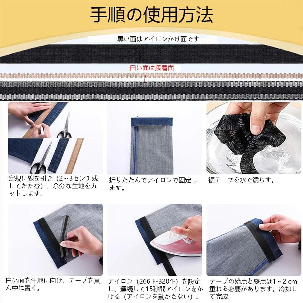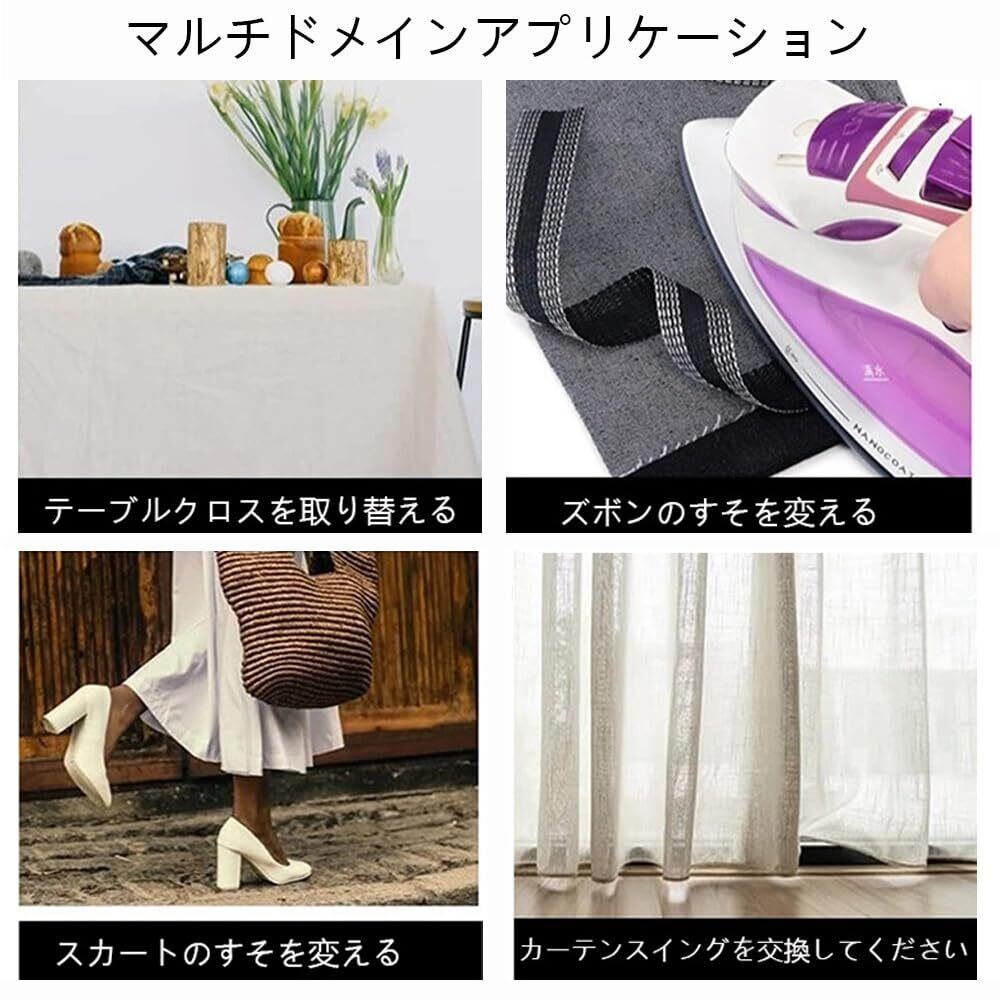 【幅広く使用】糸や針を使わず、面倒な縫製を避けています。ズボンの裾や袖口を適切な位置に短くするのに適しており、各種織物などにも適している。カーテン、テーブルクロス、シーツ、スカートの裾などのサイズ調整に使用できる。