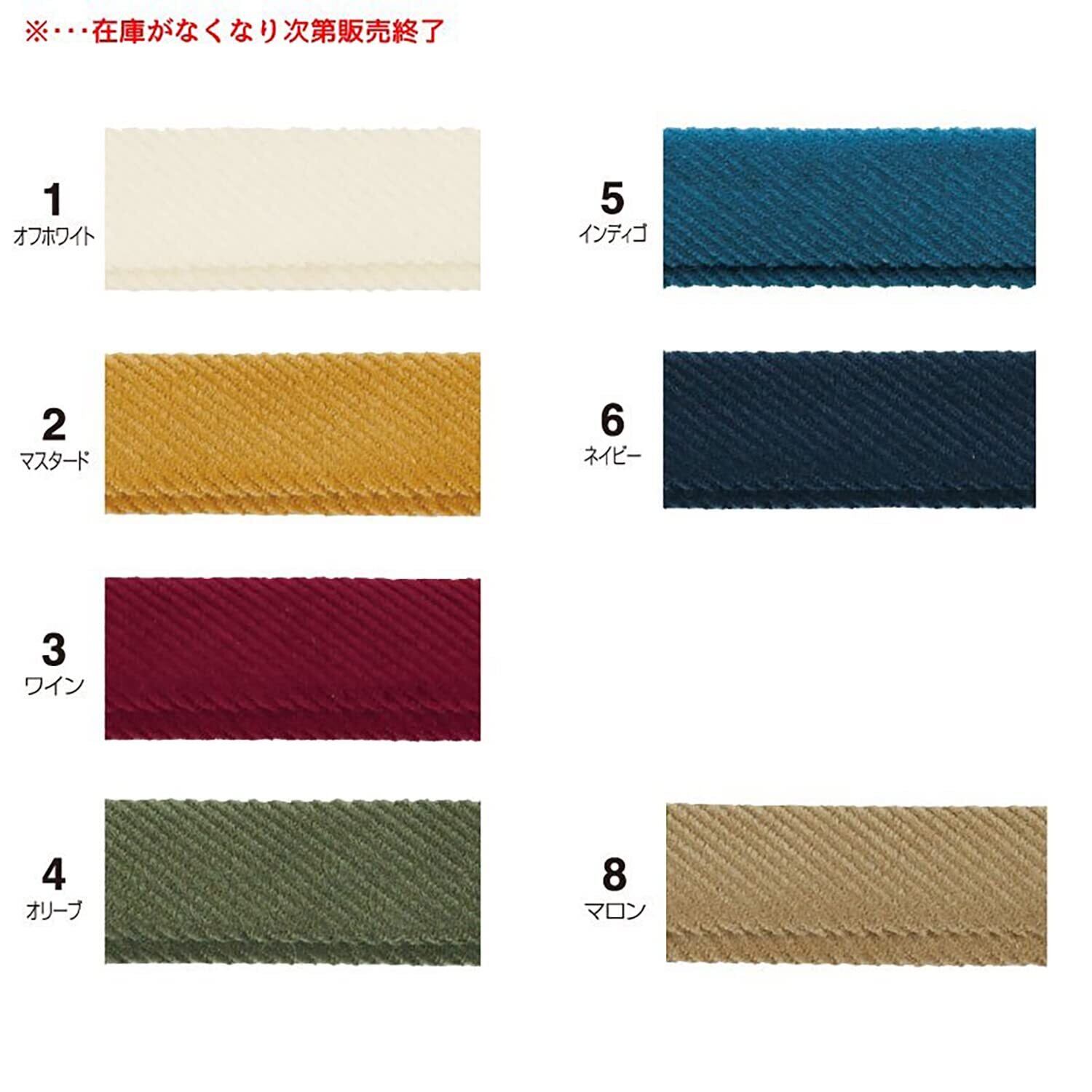 落ち着いた 色 合いの コーデュロイ 生地 を使用した バイアス テープ です。 生地 は 厚目 で、少し 毛 足があります。 秋 冬 素材 の 洋裁 におすすめです。あたたかみのある 風合い と 色 展開で、 作品 が おしゃれ に仕上がります。