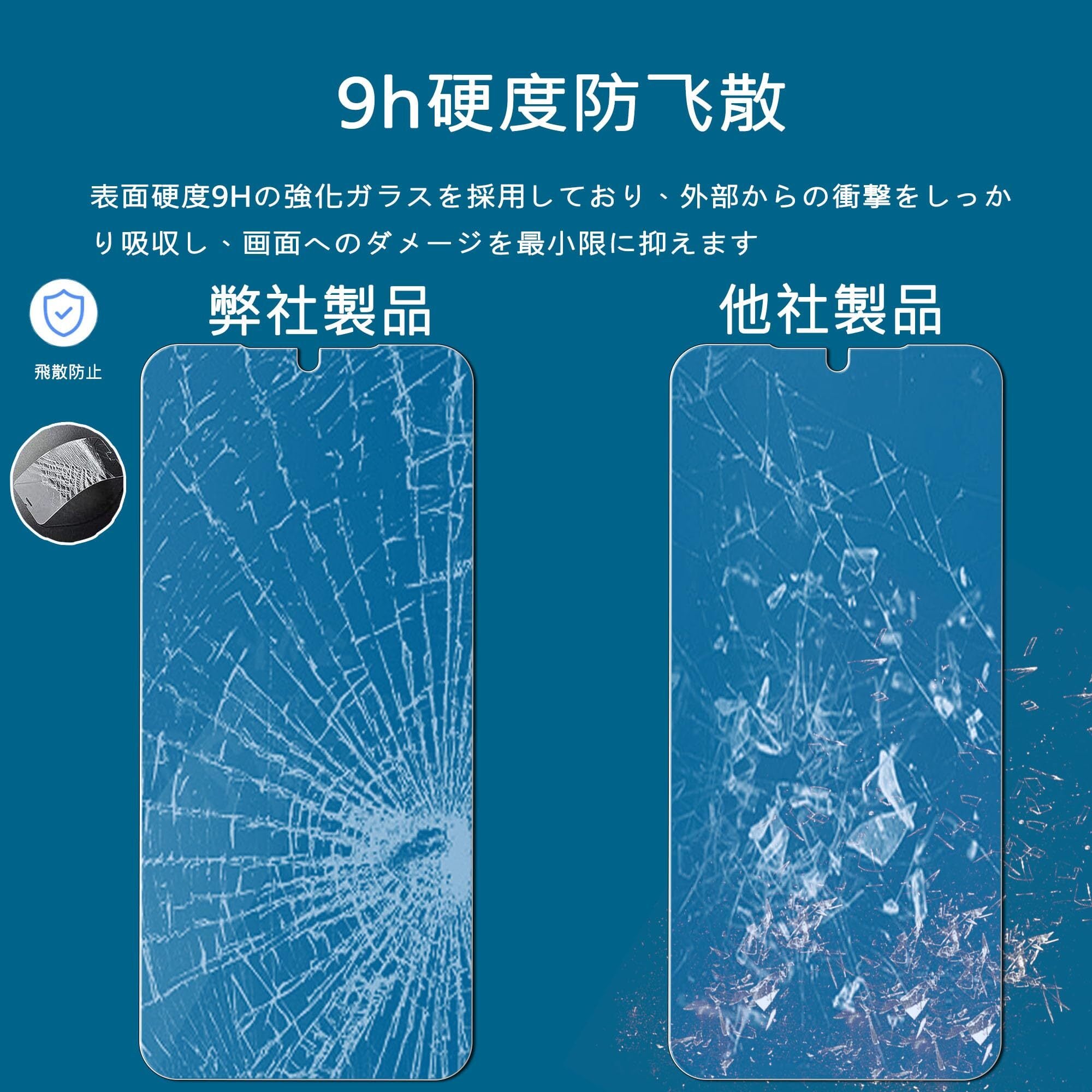 【9H硬度 飛散防止】:表面硬度9Hの強化ガラスを採用しており、外部からの衝撃をしっかり吸収し、画面へのダメージを最小限に抑えます。万が一割れてしまった場合でも、飛散防止加工により破片がフィルム内にとどまり、飛び散らず安全です