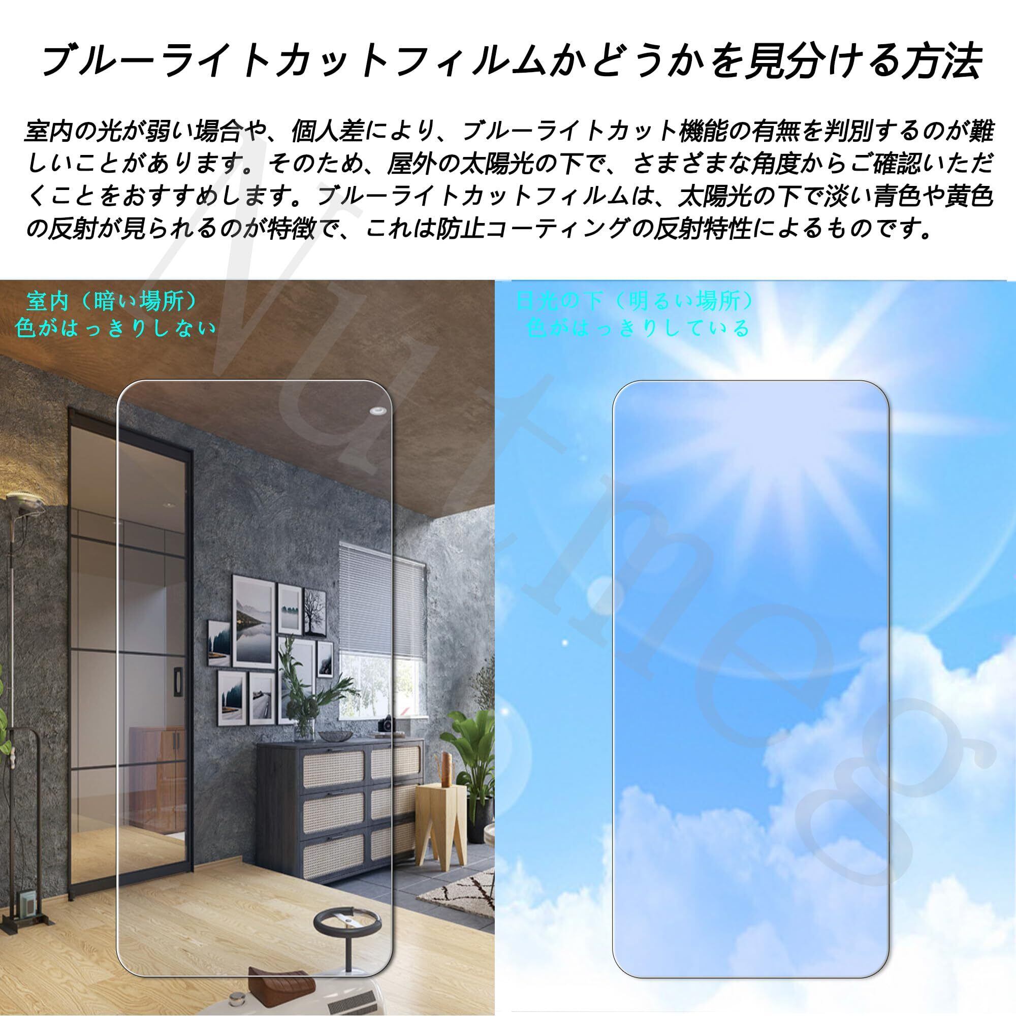 【ブルーライトカットフィルムかどうかを見分ける方法】:室内の光が弱い場合や、個人差により、ブルーライトカット機能の有無を判別するのが難しいことがあります。そのため、屋外の太陽光の下で、さまざまな角度からご確認いただくことをおすすめします。ブルーライトカットフィルムは、太陽光の下で淡い青色や黄色の反射が見られるのが特徴で、これは防止コーティングの反射特性によるものです