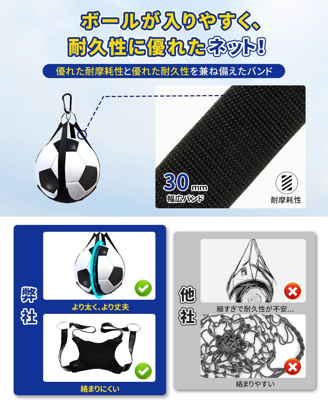 【創意の工夫】ボール入れのバンドは30mm幅で、普通のバンドより太く丈夫だ。同時に、ボール入れの底は長方形の支持構造を採用し、ボールの位置を固定し、ボールが自由に転がるのを防ぐことができる。また、ボール入れは耐摩耗性と耐久性に優れた良質な素材で作られている。さらに、ボール入れが絡まりにくいので、子供でも楽にボールが収納できる。