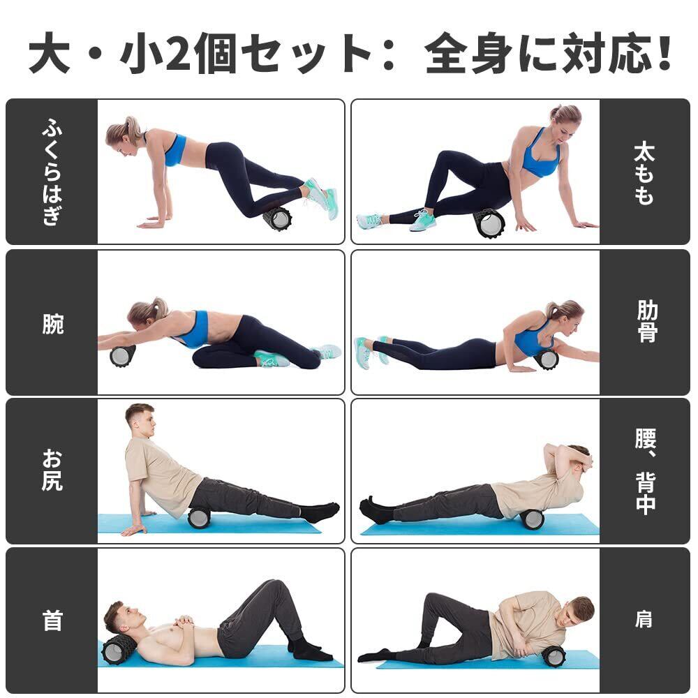 ❋ご注意:商品がアップグレードされたため、実物の色は画像にご参照ください。表記の色は無視してください。【全身に対応:お得な大・小2個セット】大きいフォームローラー:長さ33cm×直径14cm 小さいフォームローラー:長さ30.7cm×直径9.7cm フォームローラーは2個セット、サイズが違うので、身体の部位によって使い分けができます。直径が大きいため、全身をリラックスして、痛気持ちいい感じがあります。直径が小さいと仰向けで背中や腰をコロコロしやすく、とても楽になります。大きいフォームローラーは自宅でのご使用、小さいフォームローラーは持ち歩きに便利です。