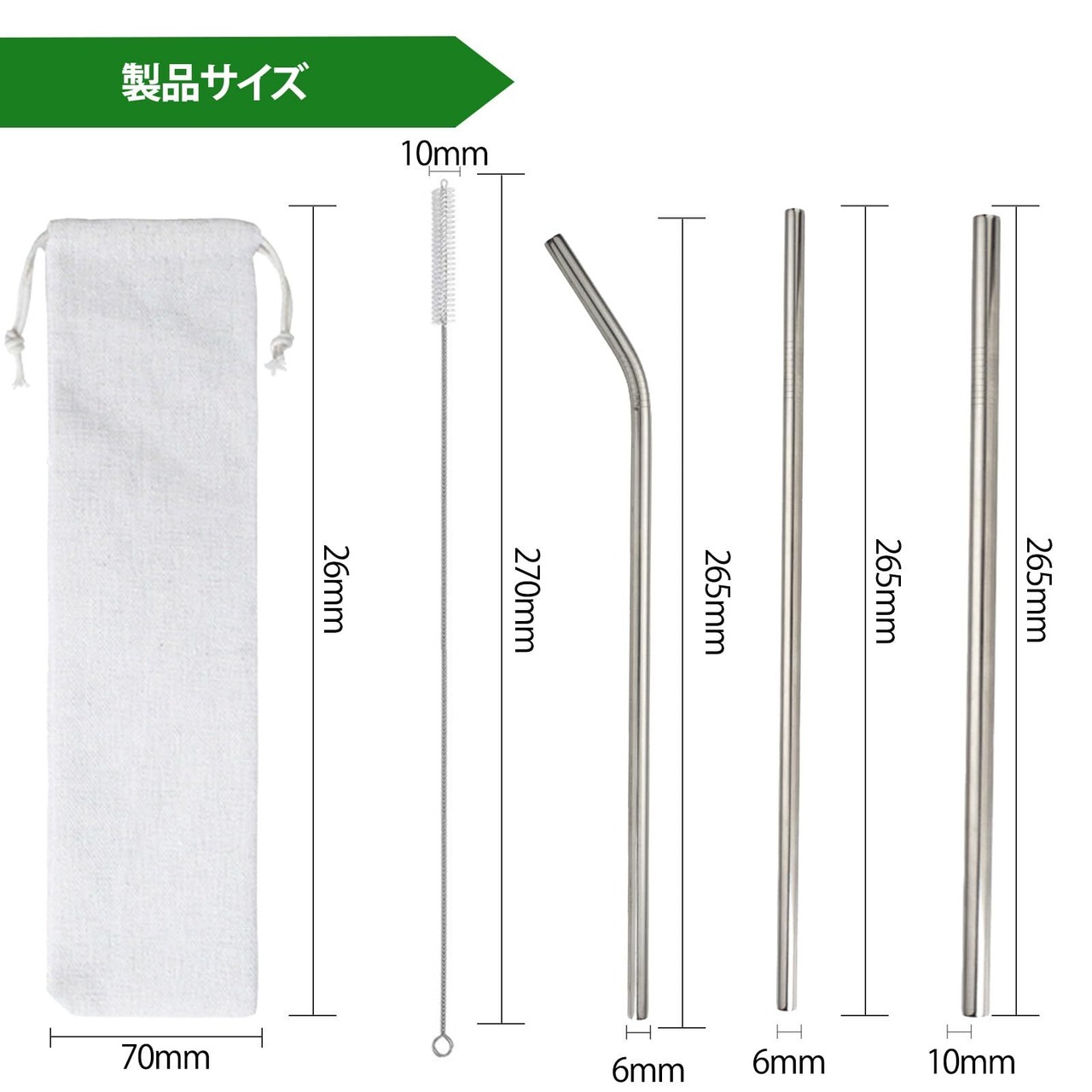 ステンレス ストロー 4本セット, 長さ265mm(直径6mm/10mm), ストローブラシ付き, 収納袋付き