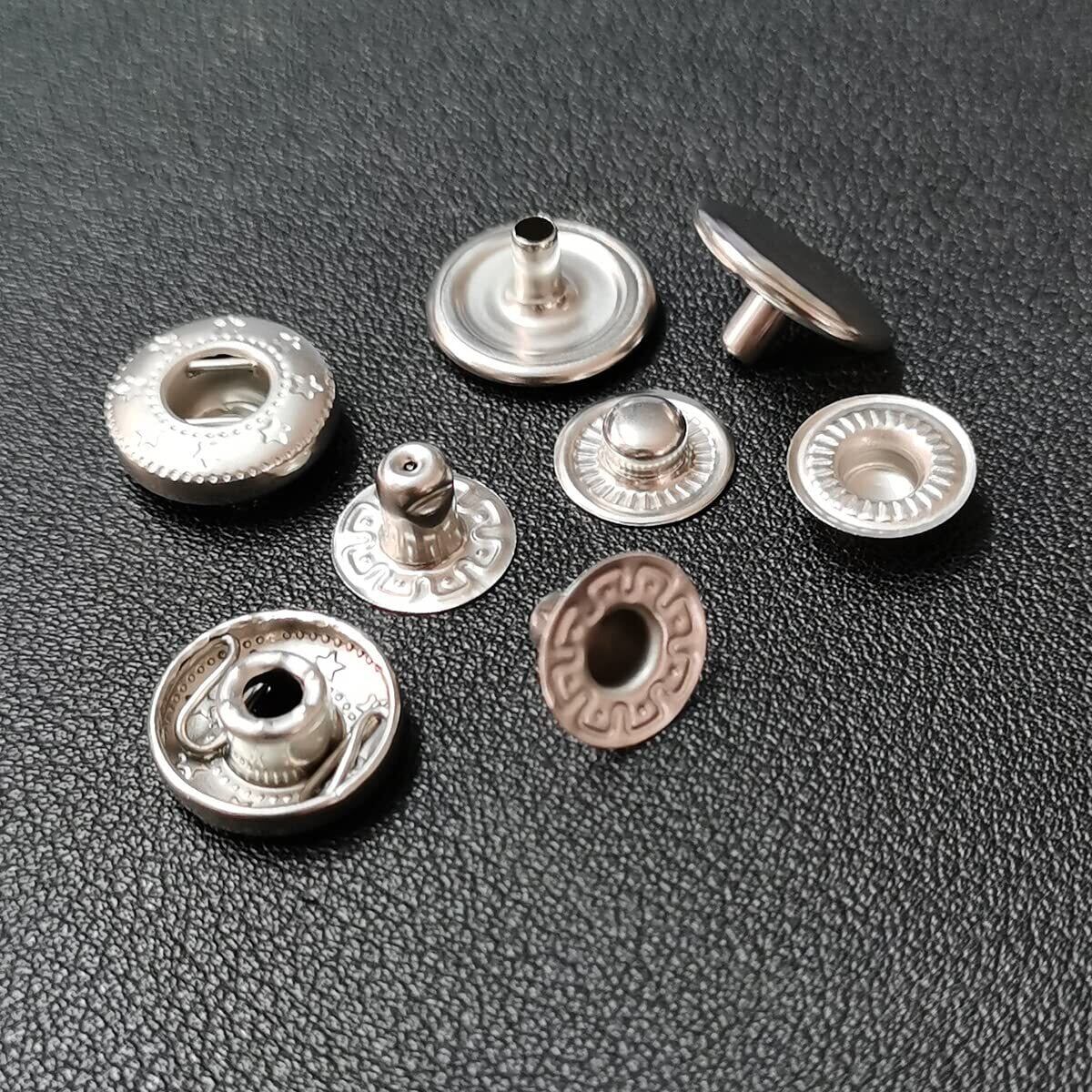 手芸、修理用カシメセット,鞄、財布、服、アクセサリー等様々なホックの取付作業に必須の定番セットになります,レザークラフトでは、レザーバッグのポケットや、革財布のボタン、薄手のレザージャケットのフロント釦、ブレスレット、スマホケースなどに使用されます,