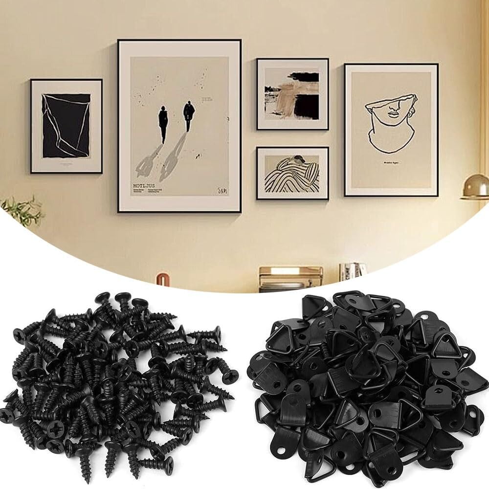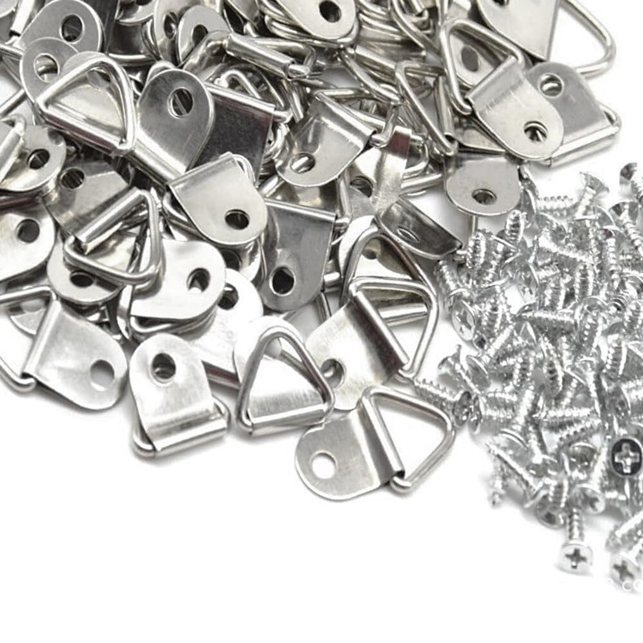 三角吊りカン 100個セット 額吊り金具 額縁金具 ビラカン 豆カン フック 三角吊金具 木ネジ付き 箱付き (シルバー)