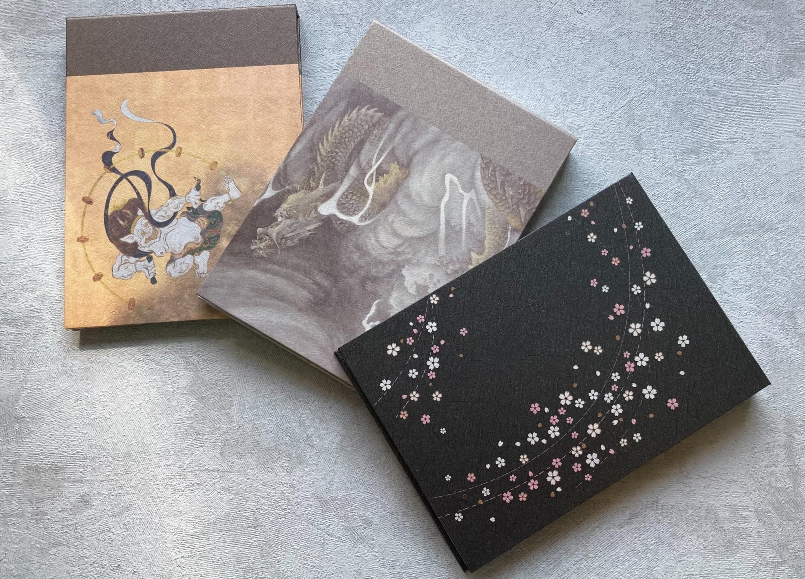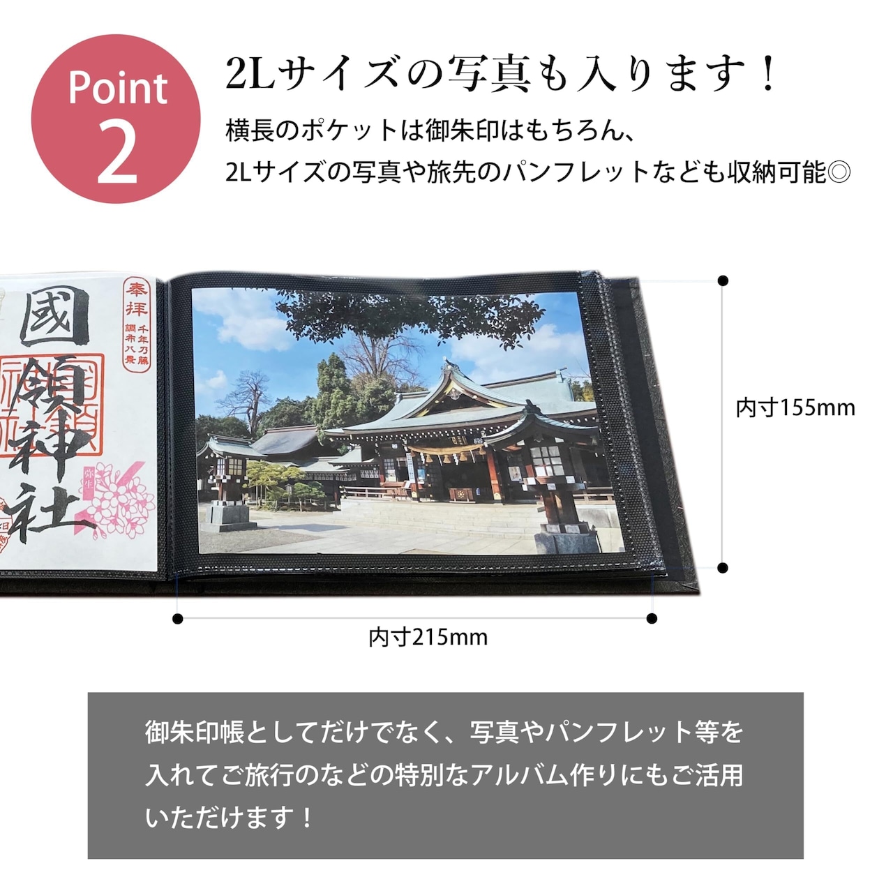 ポケット式のデザインは、まさにその自由度にこだわっています。従来の御朱印帳ではページをめくるたびにどこに御朱印があるのか探さなければならず、ファイル自体が重く感じることもありますが、このポケット式ファイルは、各ポケットに書き置き御朱印を収納するだけで、すぐに取り出すことができます。しかも、ポケットは2L写真サイズに対応しており、御朱印はもちろん、2Lサイズの写真や旅先のパンフレットなでも収納可能です。 さらに、このファイルは使い勝手だけではなく、デザインにもこだわりが満載です。派手すぎず、シンプルでおしゃれなデザインは、持っているだけで気分が上がるものです。ファイルの表面には、「さくら黒」「風神雷神」「雲龍」といった伝統的な柄が施されており、どれも日本の美を感じさせる素晴らしいデザインです。「さくら黒」は、桜の花が描かれた優雅で落ち着いた印象を与えるデザインで、春の風情を感じさせます。「風神雷神」は、力強い風神と雷神の姿を描いており、壮大でダイナミックな雰囲気を醸し出します。これらのデザインは、御朱印ファイルを使うたびに心を豊かにし、御朱印集めをより一層楽しくする要素となっています。