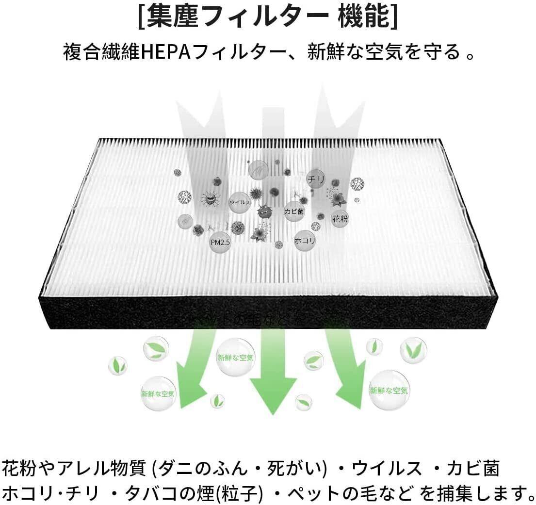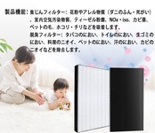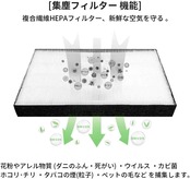 【製品機能】PM2.5/スモッグ等の除去;集じん機能:花粉やアレル物質(ダニのフン・死骸)、ウイルス、カビ菌/ホコリ チリ、タバコの煙(粒子)、ペットの毛、タバコのにおい、トイレのにおい、生ゴミのにおい、ペットのにおいなどを捕集できます;脱臭機能:料理臭、ペット臭、部屋干し衣類の生乾き臭、加齢臭などを消臭できます。タバコの煙(ニオイ)、トイ レのニオイ、生ゴミの ニオイ、ペットのニオイ などの生活臭を吸着・分解します。