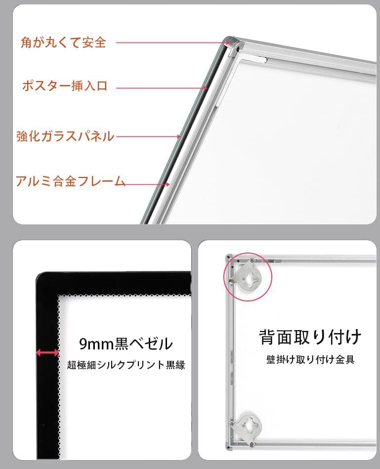 【取付簡単】レームの厚さはわずか9mm,一辺交換隙間からポスターを簡単に入り出す設計です。絶妙なプロファイルとシームレスなスプライス、軽量で薄く、壁に簡単に取り付けることができます。卓上用スタンドと壁掛け用金具が付属しており、卓上でも壁掛けでも使用でき、大変便利です。横置き、縦置きでも設置場所に限らず、どこにもポスターが掲示できます。(※専用スタントはA4.A3サイズのみ付属しています。)