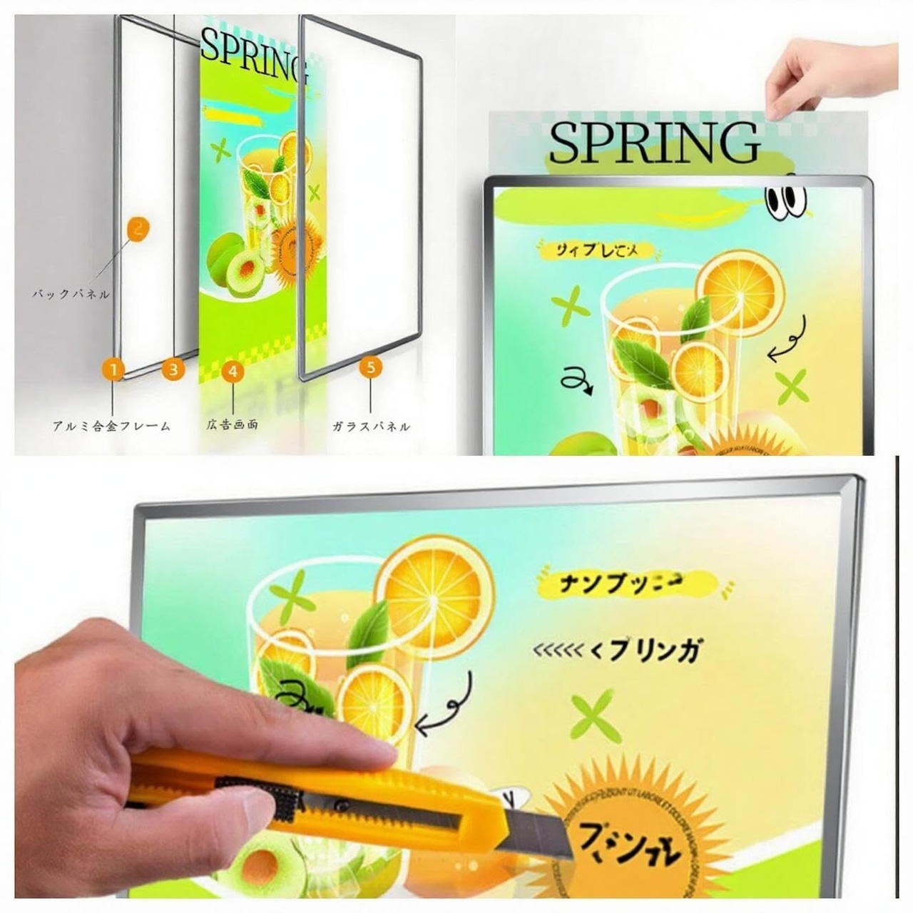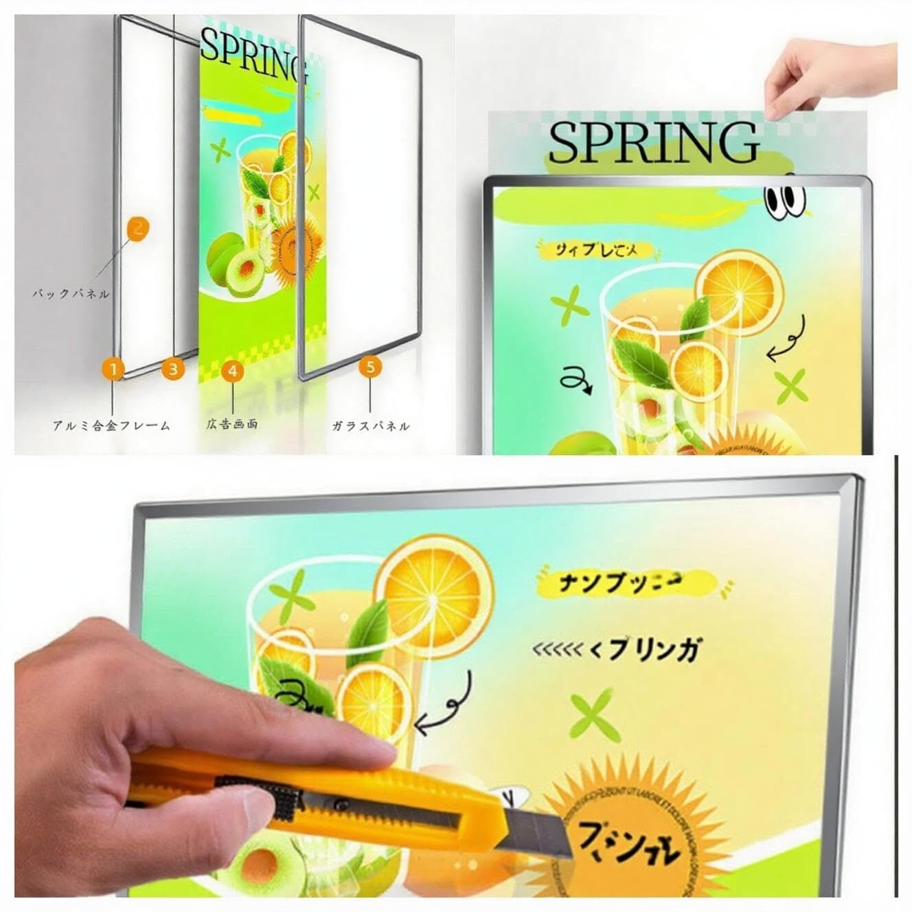 このポスターパネルは、店舗のメニュー表示、イベントの告知、お知らせや説明文など、さまざまな用途に活用できます。内容を簡単に差し替えることができるため、状況に応じた情報発信が可能です。