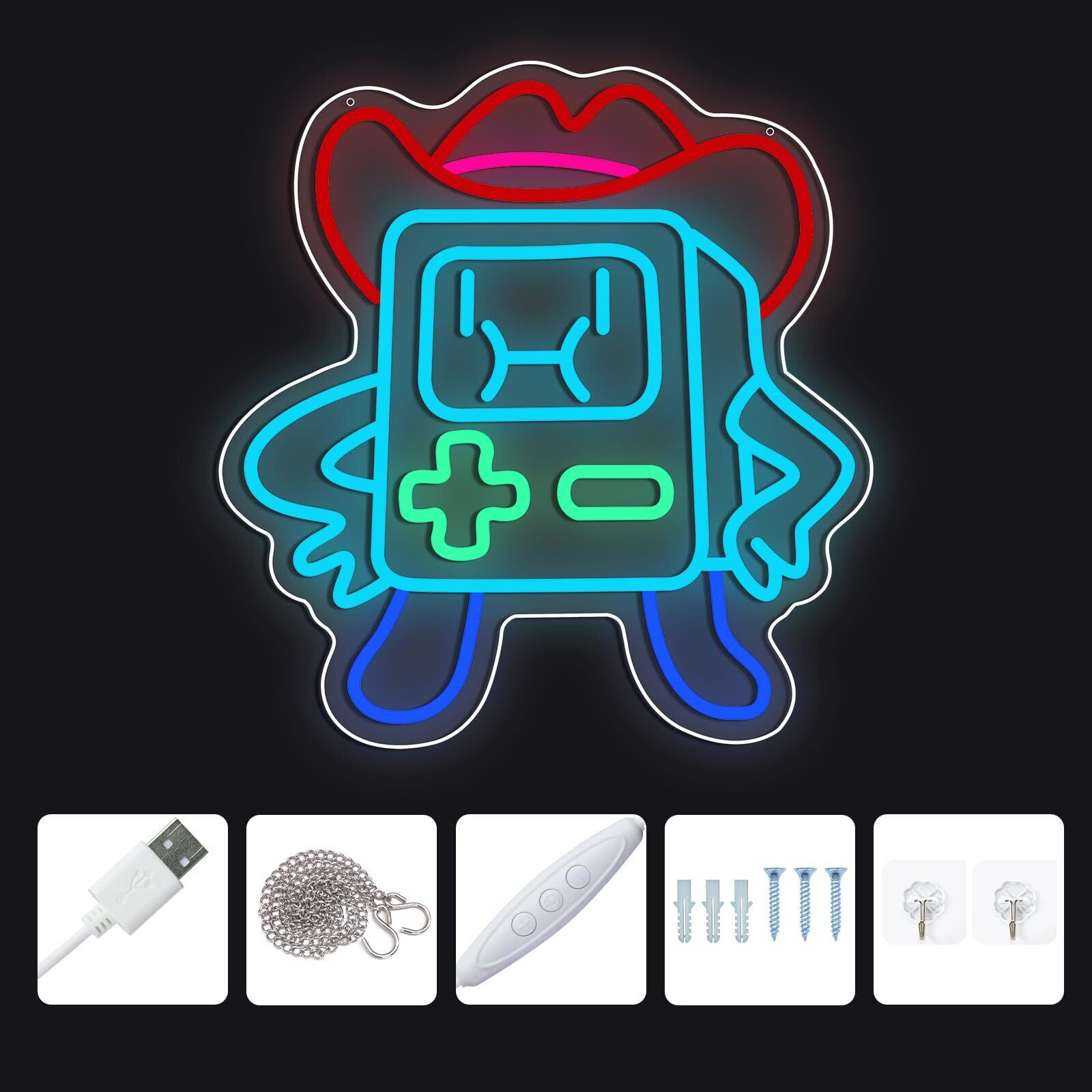 【使用方法】: ゲームロボットをモチーフにしたLEDネオンサイン。このネオンライトの上に穴があり、お気に入りの場所に置くことができます。ネオンライトは、いつでも使える便利なスイッチとUSBケーブルが付いています。ネオンライトがあなたの生活を明るくしましょう。