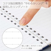 ●独自開発した「やわらかリング」を採用したリングノートです。リングノートの良さはそのままに、リングがやわらかいので手に当たっても邪魔になりません。