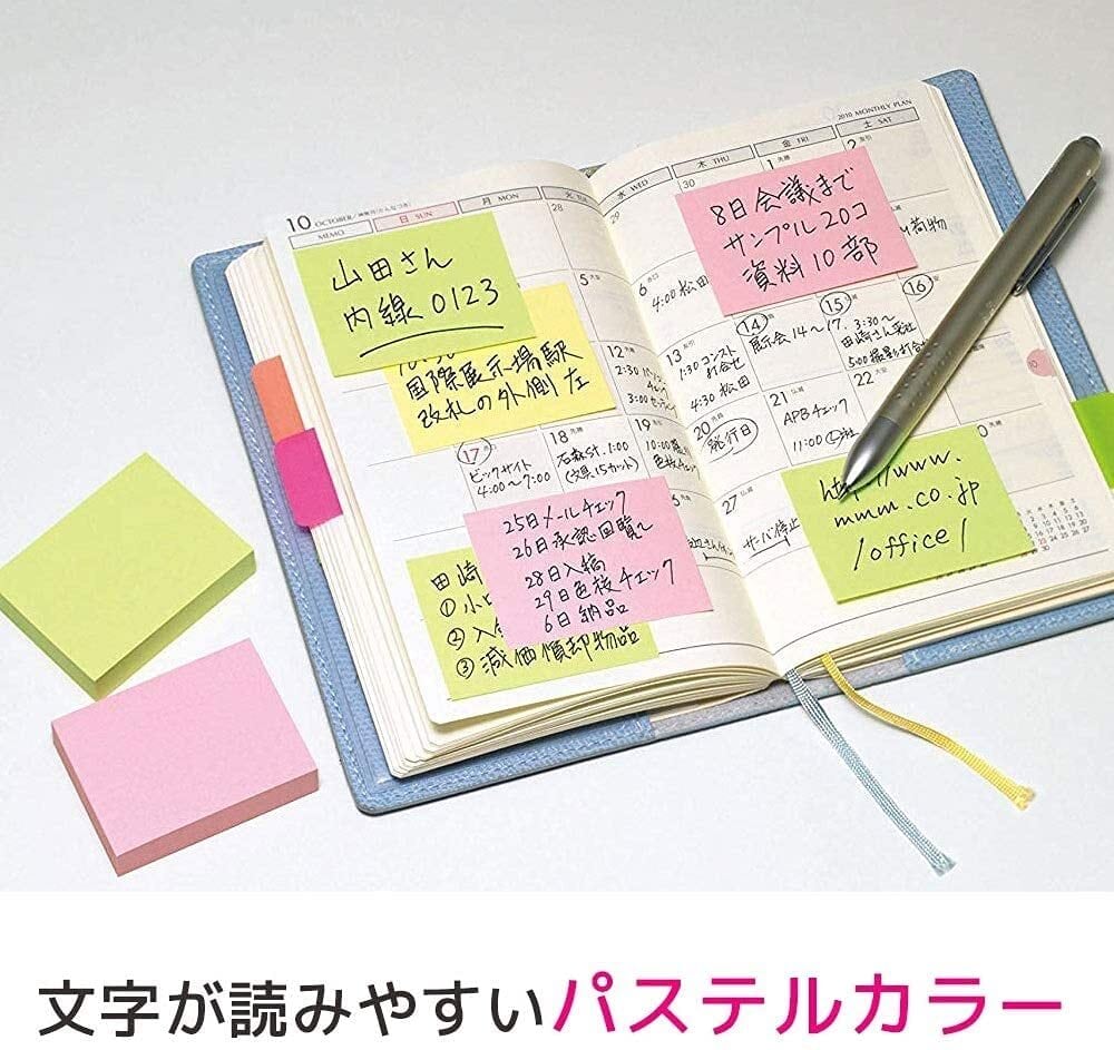 ちょっとしたメモや伝言に使いやすく、見出しやしおりなど幅広い用途に使えるサイズのポストイット付箋。