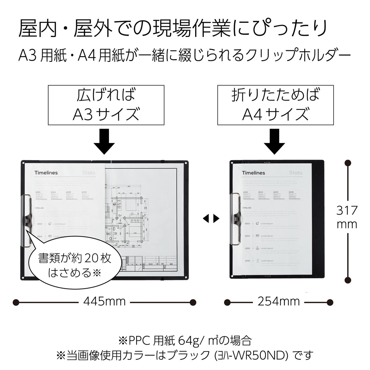 色:ブラック ■■A3でもA4でも書きやすく持ち運びも快適な2wayクリップボード■■・広げればA3・折りたためばA4に筆記面のサイズを使い分けできるので、書きやすく、またかさばらずに持ち運びができます。・屋外で書類が風にあおられにくくするためのゴムバンド付き。表紙止めにもなるのですっきりと持ち運べます。・デスクの引き出し(横幅318mm以上)に入るコンパクトサイズです。・発泡PP製の表紙は丈夫でかつ軽量なので、書類の持ち運びや屋外での使用にも適しています。・裏側にはA4書類をクリヤーホルダーに入れたまま収容できるポケット付きです。ペンも数本挟むことができます。・四隅にヒモ通し穴付きです(穴径約5mm)。・汚れが目立ちにくい本体色です。商品仕様・外寸法/展開時:高さ317×幅445×厚み7mm(クリップ部16mm)・材質/外板:発泡R-PP、内板・ポケット:R-PP
