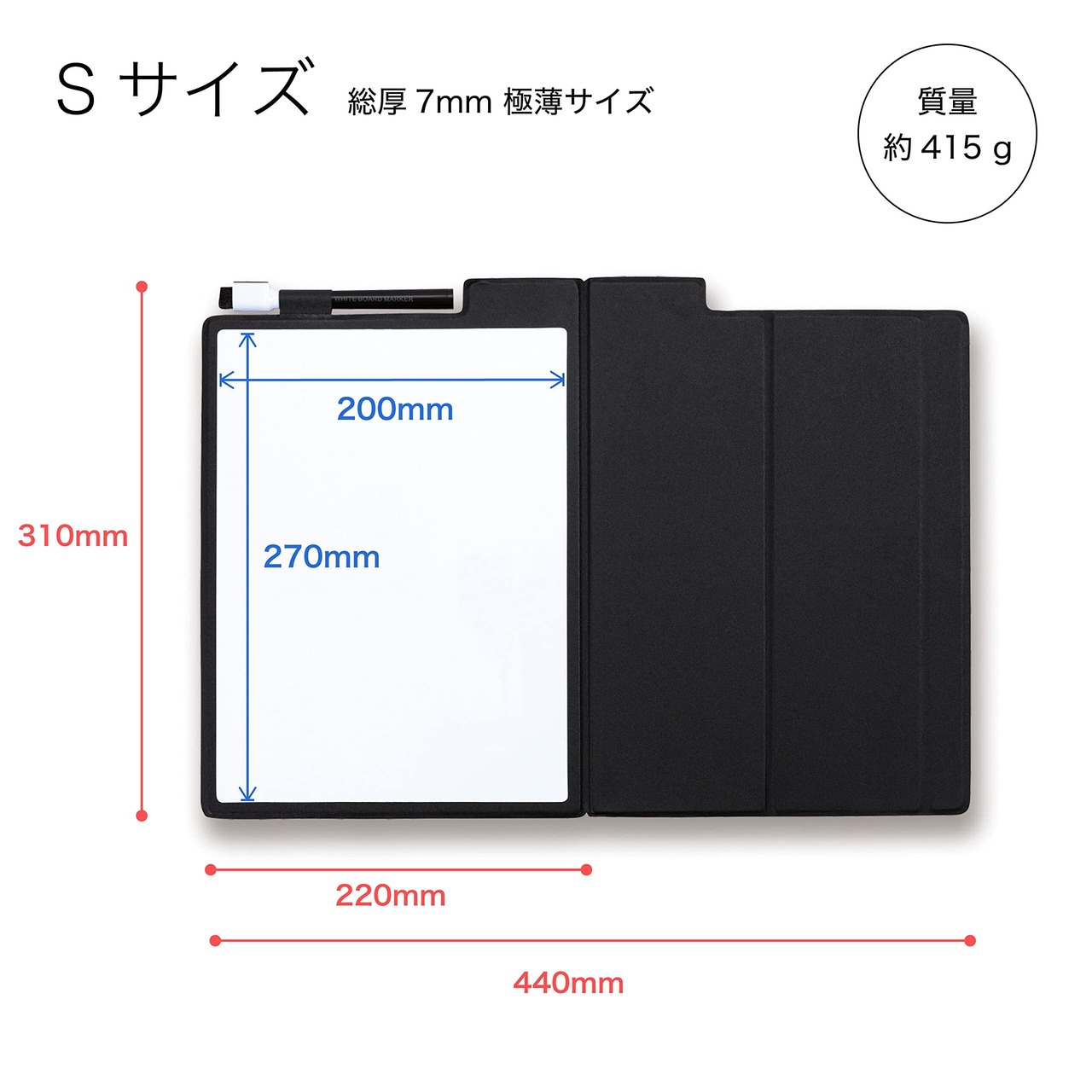 外形寸法:(閉じた時)310×220mm、ホワイトボード板面:270×200mm、(開いた時)440×310×7mm