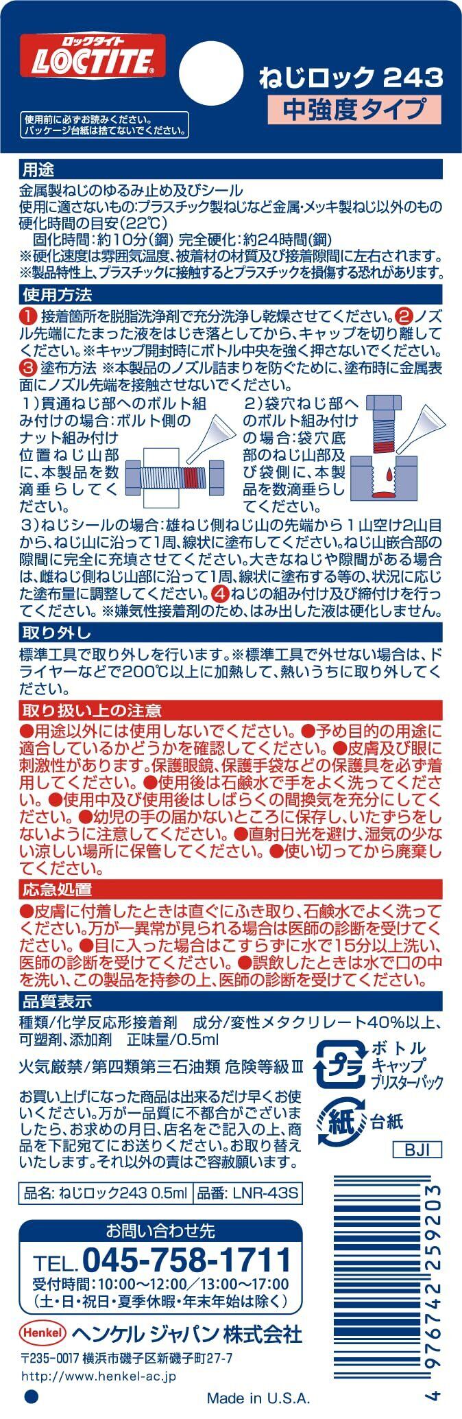【特価セール】LOCTITE(ロックタイト) ねじロック 243 中強度タイプ 10ml