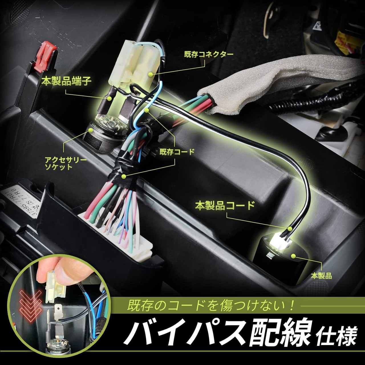 ●純正コードを傷つけずにバイパス配線で取り付けが可能です。