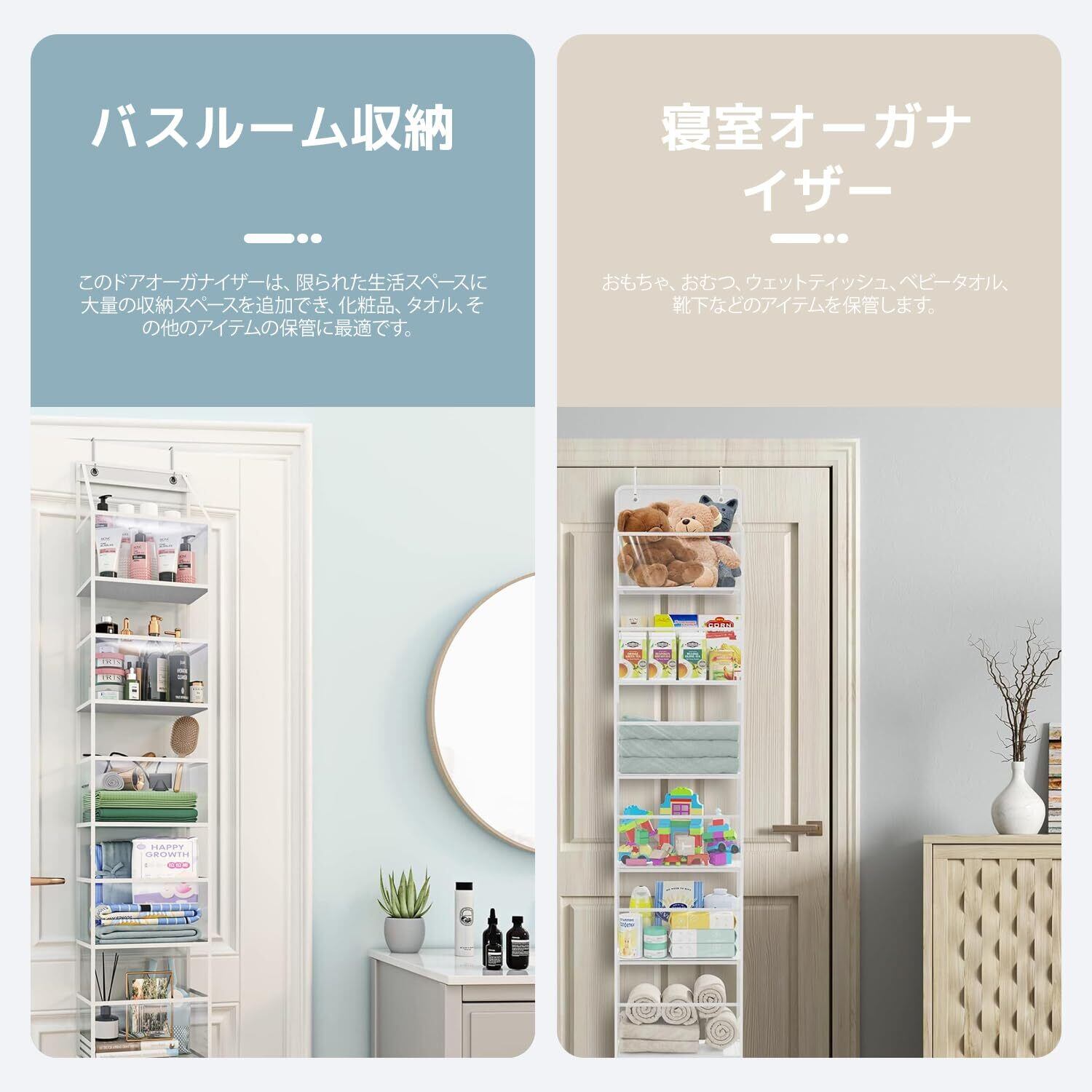 壁掛け以外にも、ドアに簡単に取り付けられるので、お部屋のサイズや形状に合わせて自由に配置できます。お子様の成長に合わせて、収納のスタイルを変えることも可能です。