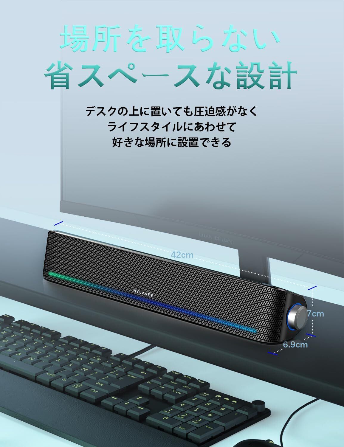 【4つのライトモード】 Nylaveeパソコンスピーカーには、カラフルシ、リズム、フロー、ブレスを含む4つのライトモードが備わっており、デスクトップを個性化し、ゲームや音楽鑑賞をより一層楽しめるようになっています。