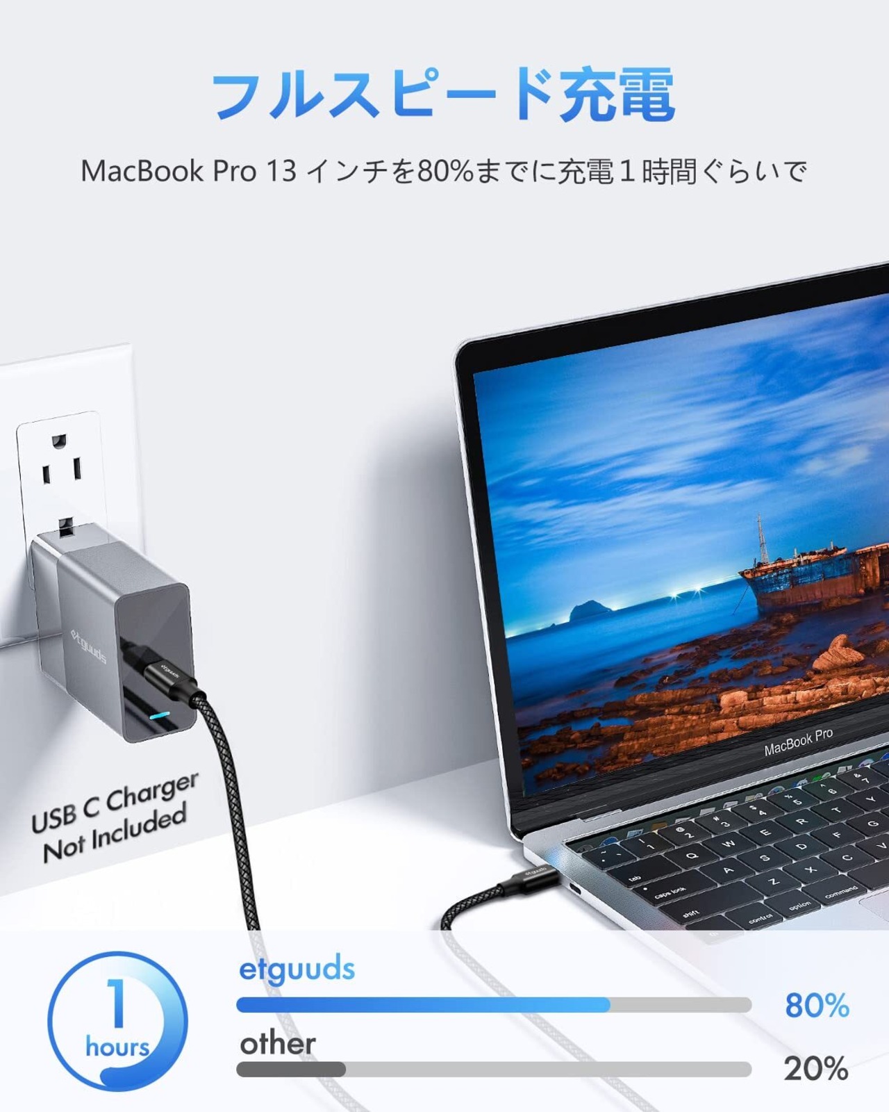 「etguuds USB C ケーブル」は、最大60WのPD(Power Delivery)に対応しており、高速充電が可能です。Macbook ProやiPad Mini、Galaxyシリーズなど、さまざまなUSB-C機器に対応しているため、デバイスを選ばず安心してお使いいただけます。
