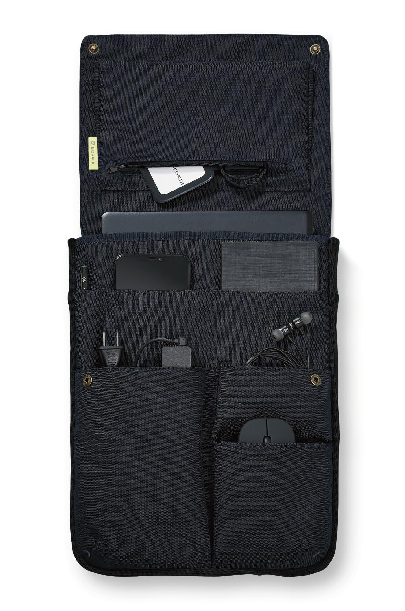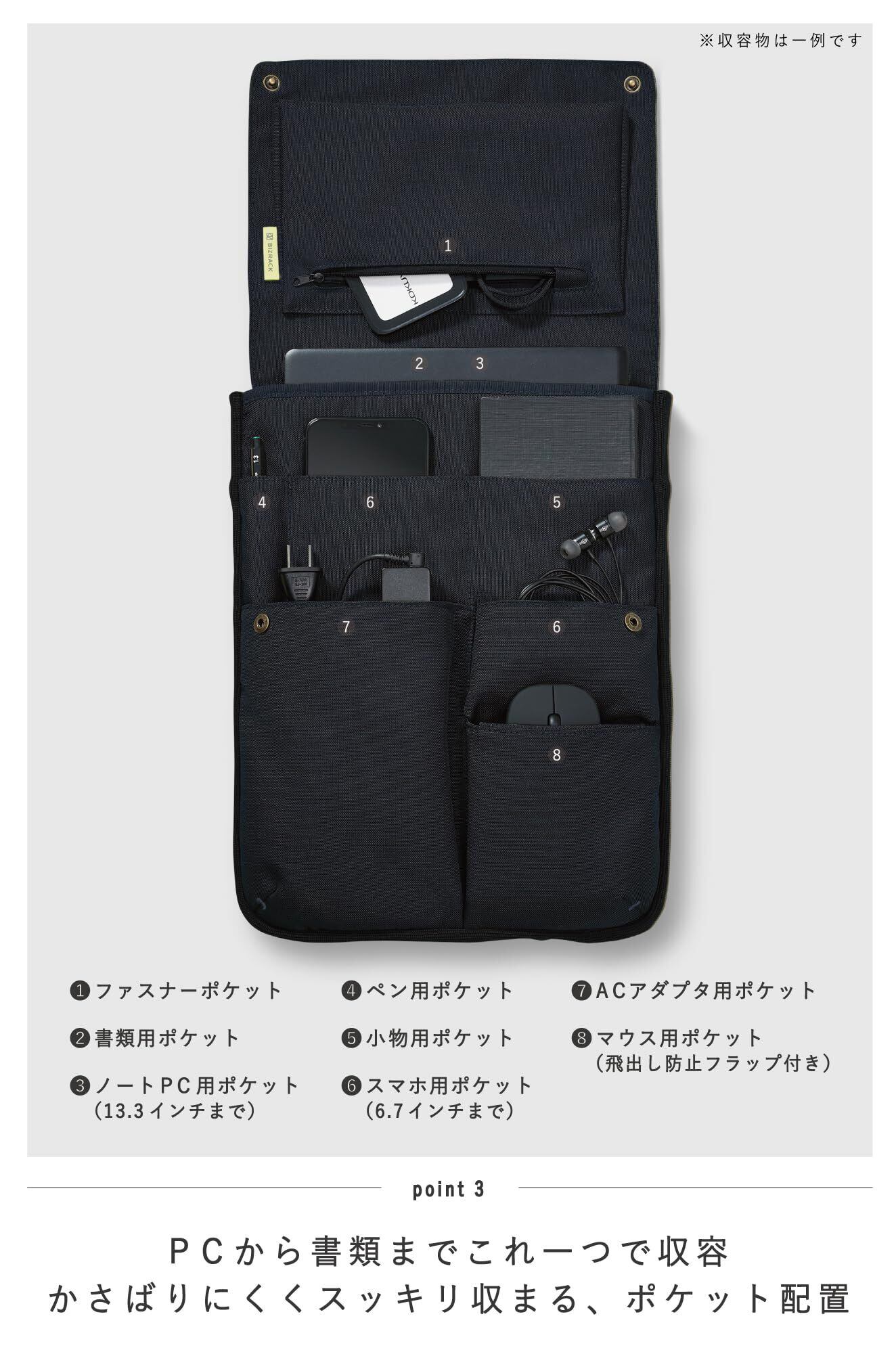 POINT3:PCから書類までこれ一つで収容。かさばりにくくスッキリ収まる、ポケット配置。