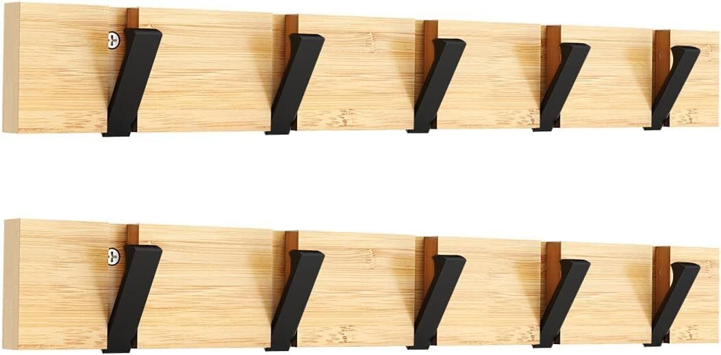 ウォールハンガー 壁取り付け式コートラック 5連フック 壁掛けフック 収納家具 物干しハンガー 帽子掛け・洋服掛け・コート掛け 木製 2個セット(黒フック折り畳み型)
