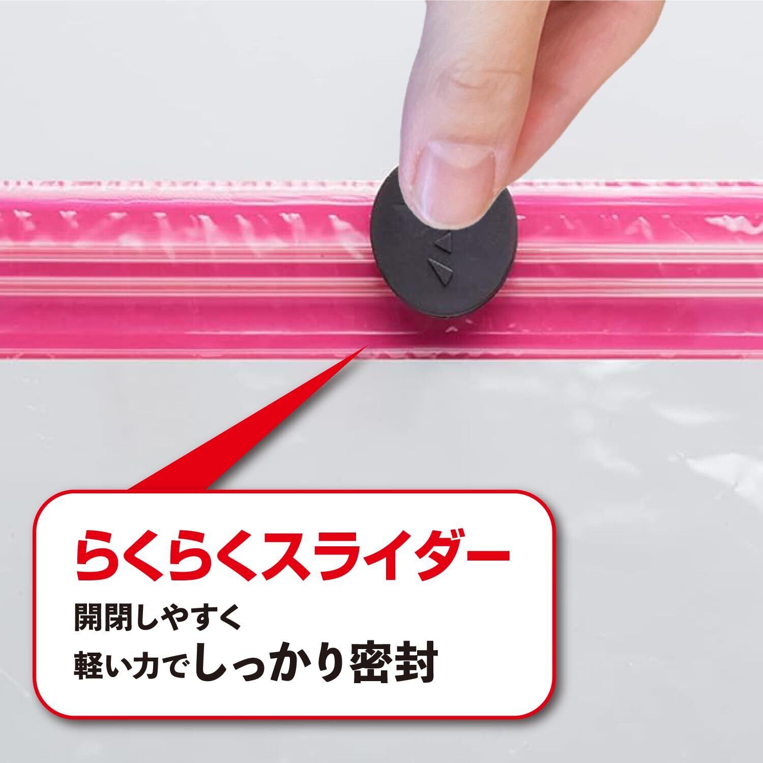 ・スピード圧縮できるアダプタ付き!空気をしっかり吸引できるバルブにピッタリサイズのアダプタを開発・とにかく外れにくい!力いらずでチャックが閉められる新スライダー・よりしっかり閉まって開けやすいカラーチャックで空気漏れの心配なし!