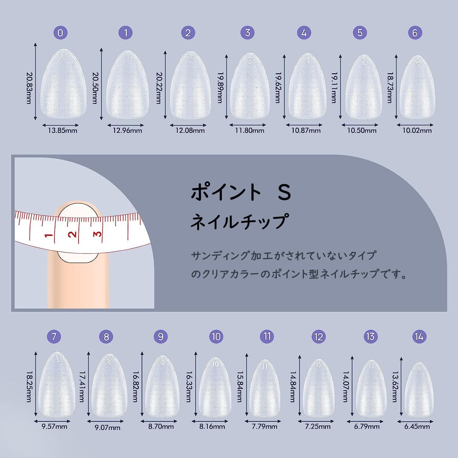 S ポイントネイルチップ 先端部分がラウンドやオーバルよりもとんがったショットポイントネイルチップです。つまり長さを出してとがらせるために、爪の縦長をアピールでき、大人っぽい華やかなデザインで仕上げたい方におすすめなのです。指がスラリと細く長く見えるので、手が小さい、爪が小さいと悩んでいる人にピッタリ!