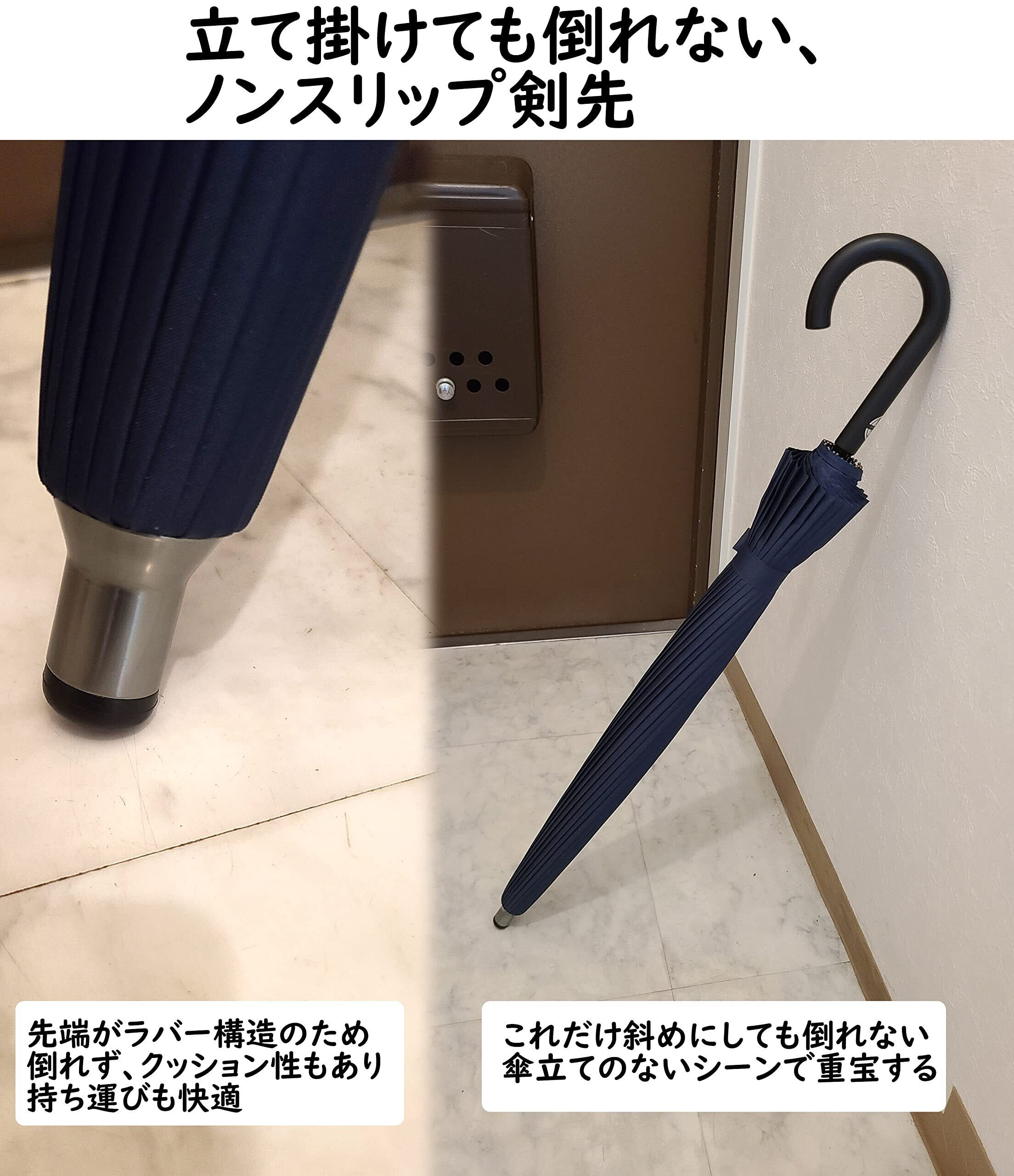 傘の先端には滑りにくいラバー素材を使用しているので、立てかけても安定感があります。これにより、使用中や使用後に置いておく際も安心です。
