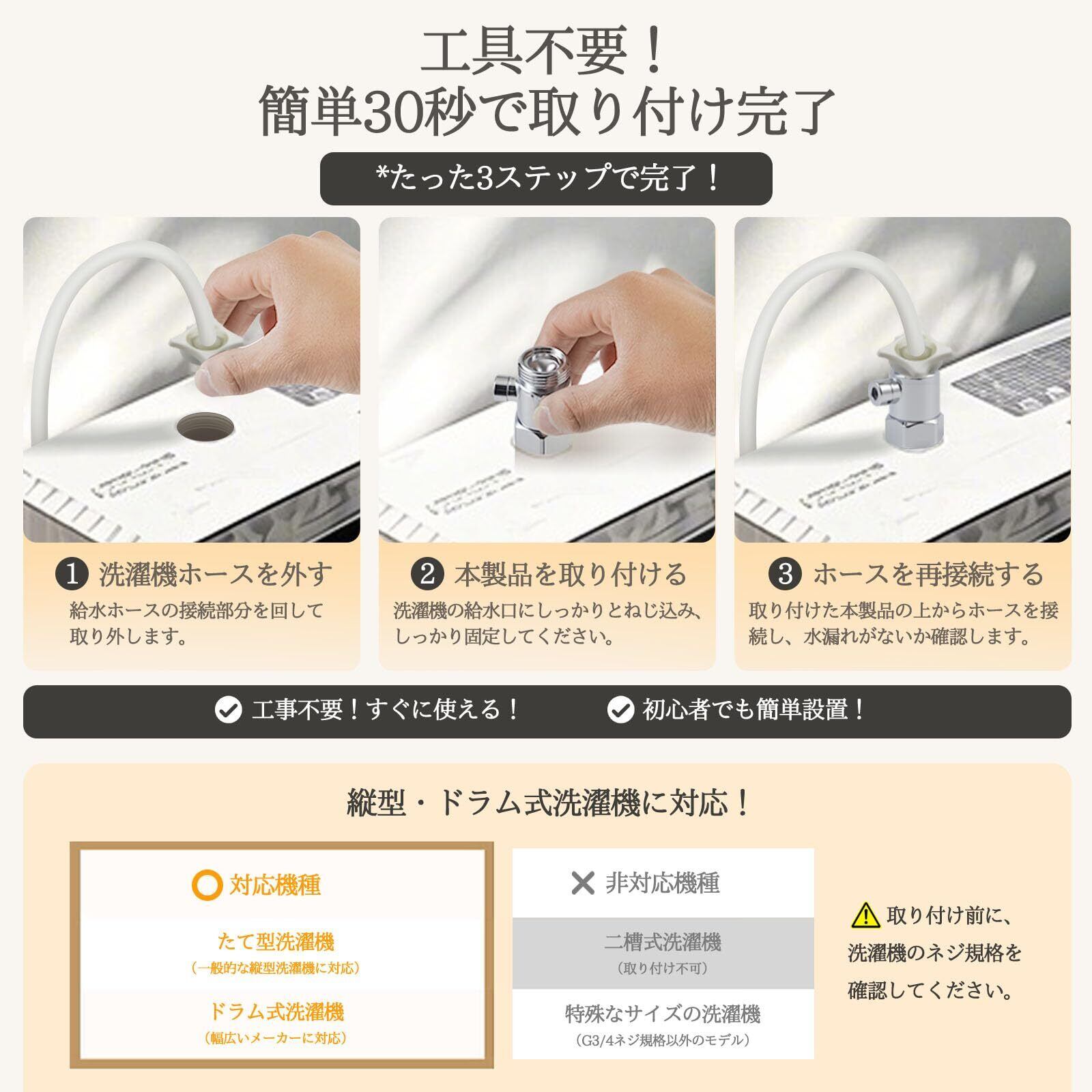 【工具不要!簡単取り付け】 給水ホースと給水口の間に挟むだけ! 工具不要で、誰でもわずか1分で設置完了! ※取り付け時は、ネジをしっかり締めてください。取り付けミスによる水漏れを防ぐため、まっすぐ確実に装着してください。