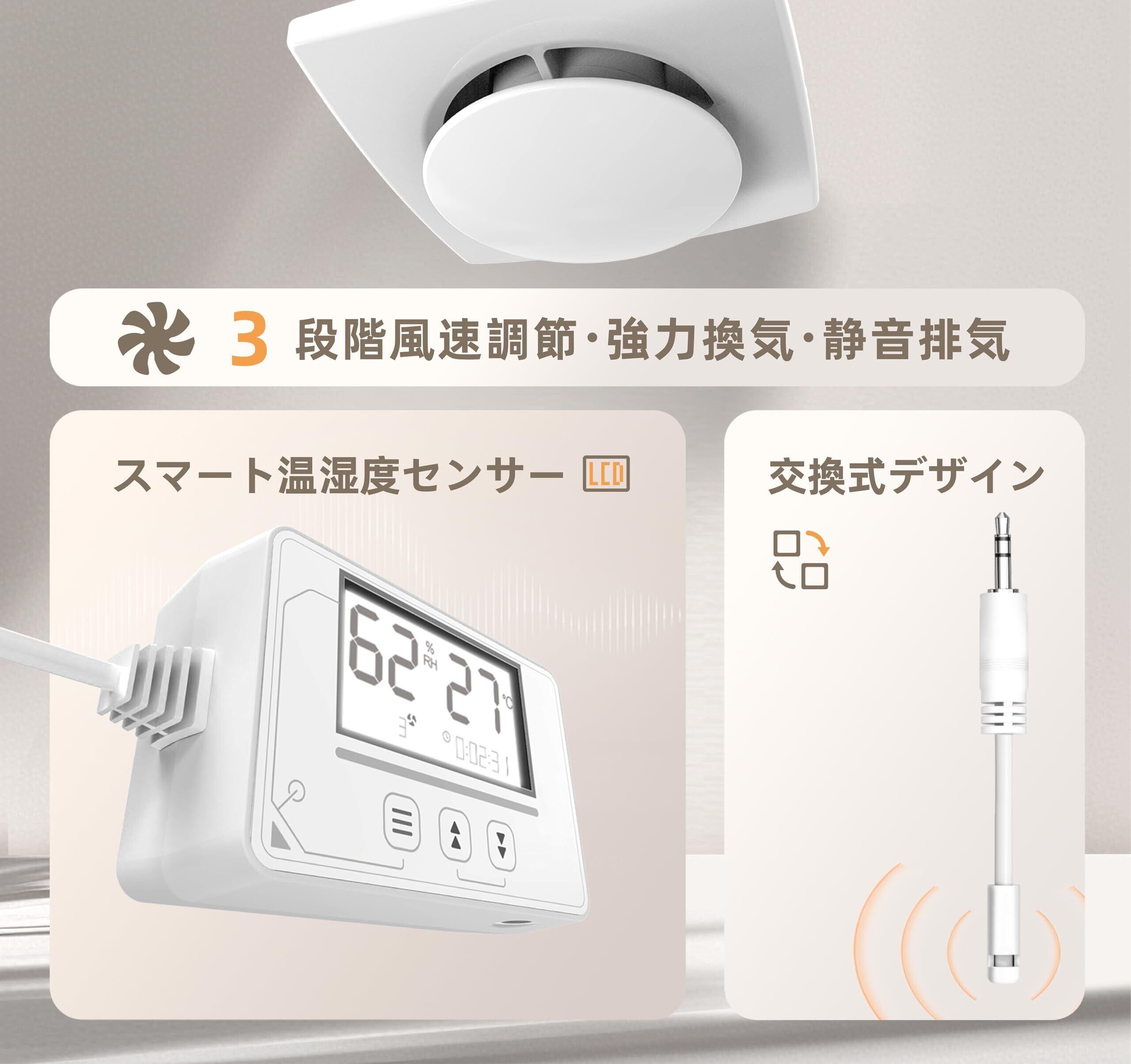 【3段階風量調節/95 - 145m³/h】1段階(1500RPM):静音換気で快適。リビング、トイレ、ランドリールーム、屋根裏、更衣室、クローゼットに最適。2段階(2000RPM):高効率除湿。湿気の多い浴室や洗濯室、地下室におすすめ。3段階(2500RPM):強力排煙。火鍋や焼肉など、油煙の多い場所に最適。