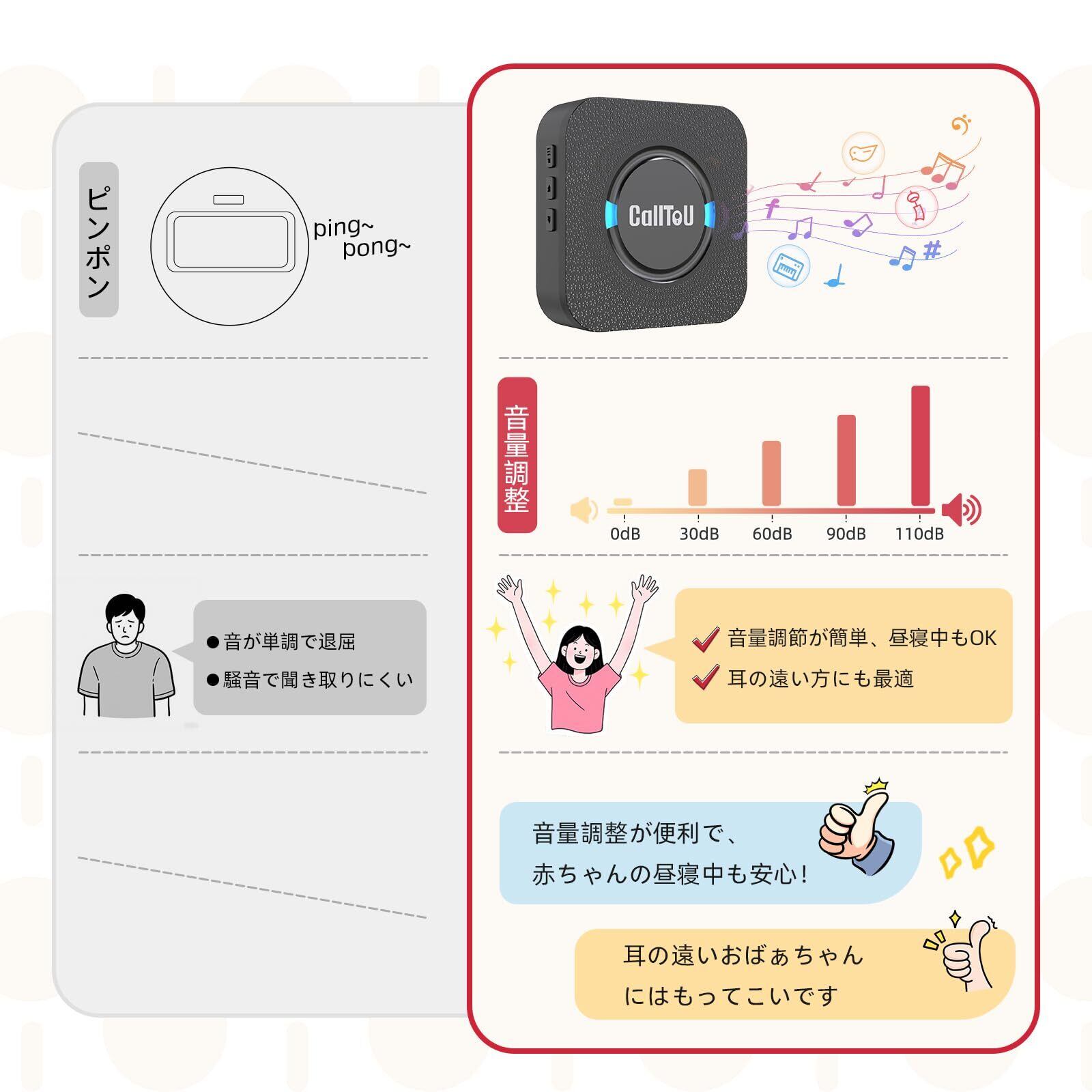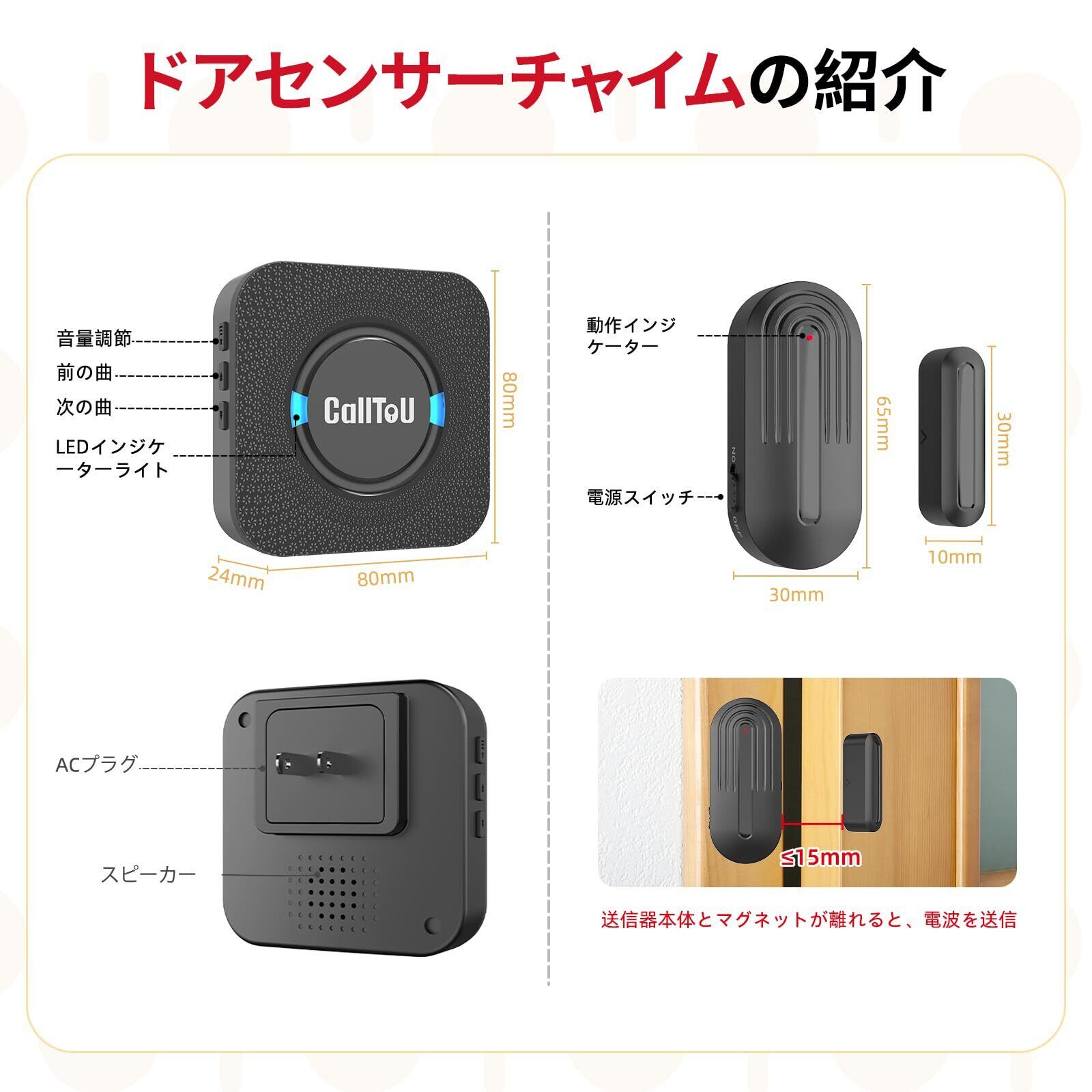 【新春セール】CallToU ドアセンサー ワイヤレス チャイム ドアベル ドア開閉センサー セット ドアチャイム 防犯アラーム 5段階音量調整 55曲選択 150m通信距離 玄関 部屋 事務所 店舗 自動ドア対応 ドア開閉チャイム 防犯対策 2AC式受信機&1電池式マグネットセンサー